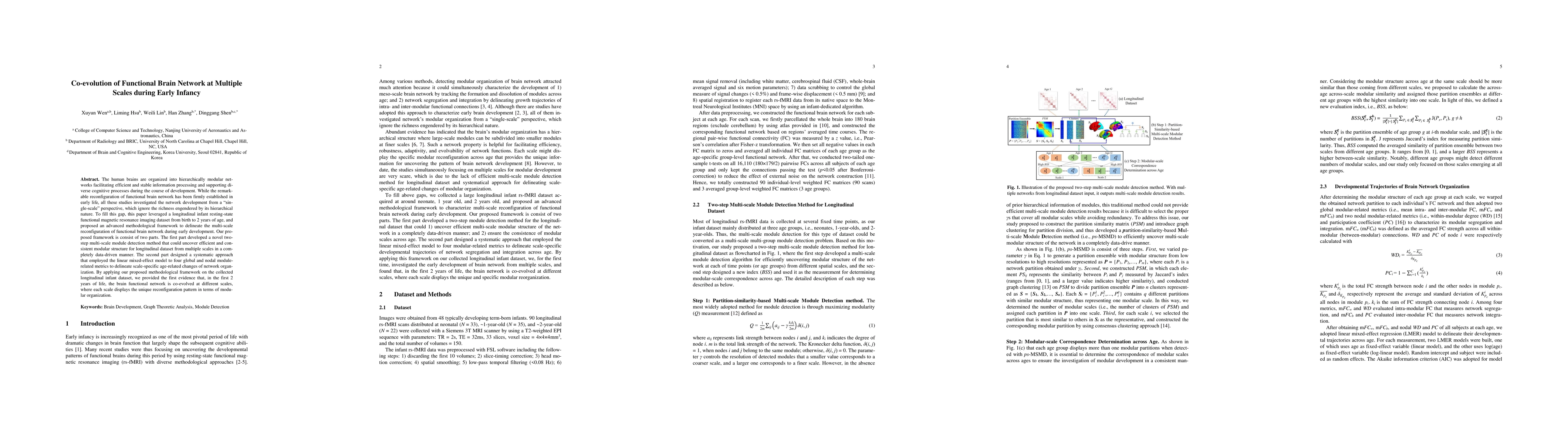 The human brains are organized into hierarchically modular networks facilitating efficient and stable information processing and supporting diverse cognitive processes during the course of development. While the remarkable reconfiguration of functional brain network has been firmly established in early life, all these studies investigated the network development from a "single-scale" perspective, which ignore the richness engendered by its hierarchical nature. To fill this gap, this paper leveraged a longitudinal infant resting-state functional magnetic resonance imaging dataset from birth to 2 years of age, and proposed an advanced methodological framework to delineate the multi-scale reconfiguration of functional brain network during early development. Our proposed framework is consist of two parts. The first part developed a novel two-step multi-scale module detection method that could uncover efficient and consistent modular structure for longitudinal dataset from multiple scales in a completely data-driven manner. The second part designed a systematic approach that employed the linear mixed-effect model to four global and nodal module-related metrics to delineate scale-specific age-related changes of network organization. By applying our proposed methodological framework on the collected longitudinal infant dataset, we provided the first evidence that, in the first 2 years of life, the brain functional network is co-evolved at different scales, where each scale displays the unique reconfiguration pattern in terms of modular organization.
