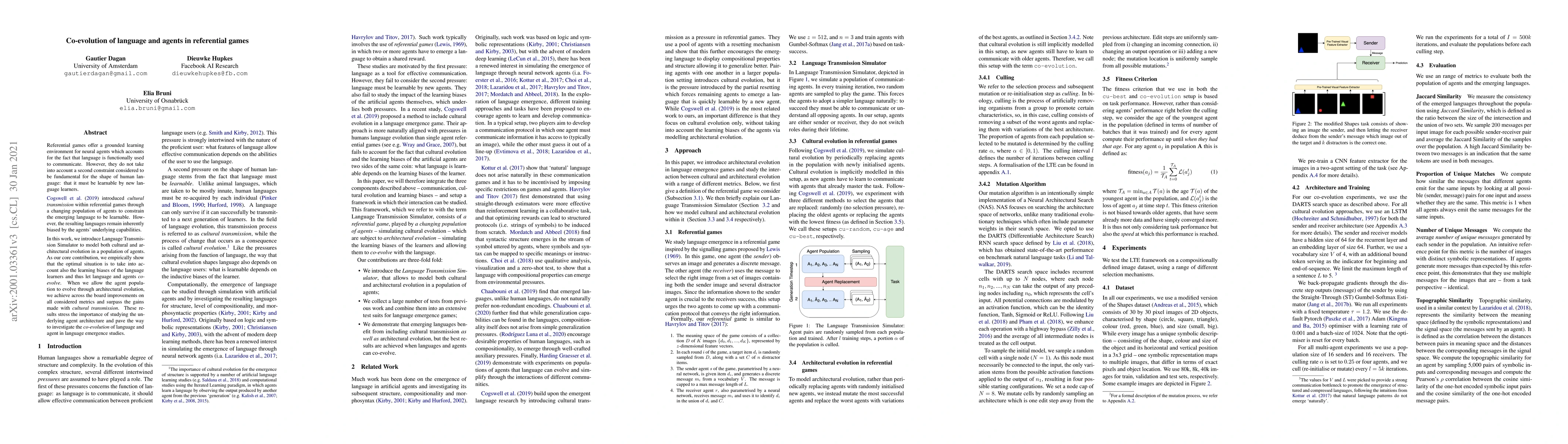 Referential games offer a grounded learning environment for neural agents which accounts for the fact that language is functionally used to communicate. However, they do not take into account a second constraint considered to be fundamental for the shape of human language: that it must be learnable by new language learners. Cogswell et al. (2019) introduced cultural transmission within referential games through a changing population of agents to constrain the emerging language to be learnable. However, the resulting languages remain inherently biased by the agents' underlying capabilities. In this work, we introduce Language Transmission Engine to model both cultural and architectural evolution in a population of agents. As our core contribution, we empirically show that the optimal situation is to take into account also the learning biases of the language learners and thus let language and agents co-evolve. When we allow the agent population to evolve through architectural evolution, we achieve across the board improvements on all considered metrics and surpass the gains made with cultural transmission. These results stress the importance of studying the underlying agent architecture and pave the way to investigate the co-evolution of language and agent in language emergence studies.