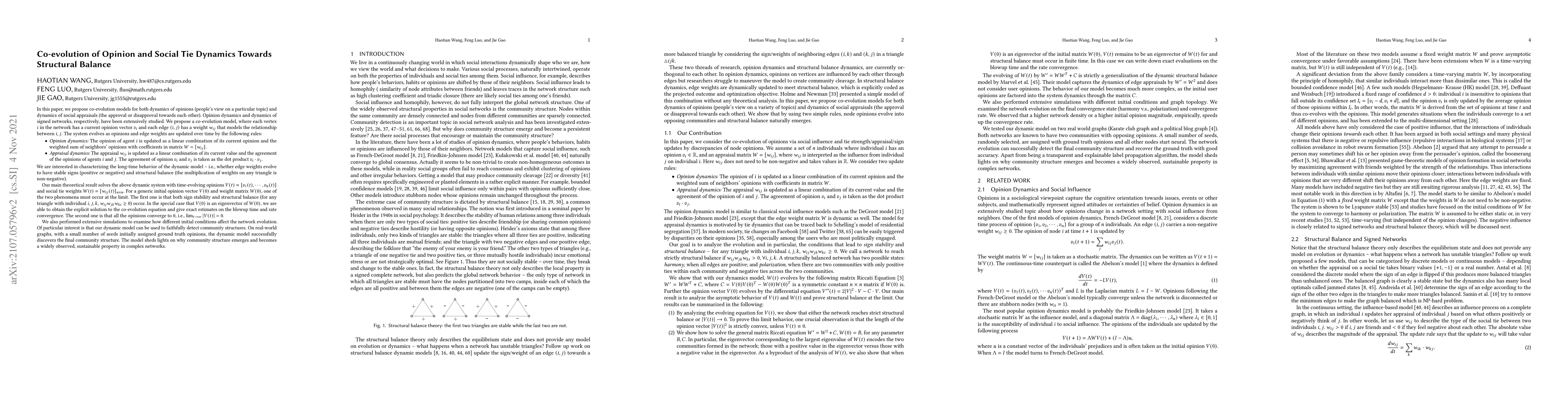 In this paper, we propose co-evolution models for both dynamics of opinions (people's view on a particular topic) and dynamics of social appraisals (the approval or disapproval towards each other). Opinion dynamics and dynamics of signed networks, respectively, have been extensively studied. We propose a co-evolution model, where each vertex $i$ in the network has a current opinion vector $v_i$ and each edge $(i,j)$ has a weight $w_{ij}$ that models the relationship between $i,j$. The system evolves as the opinions and edge weights are updated over time by the following rules, Opinion Dynamics and Appraisal Dynamics. We are interested in characterizing the long-time behavior of the dynamic model -- i.e., whether edge weights evolve to have stable signs (positive or negative) and structural balance (the multiplication of weights on any triangle is non-negative). Our main theoretical result solves the above dynamic system with time-evolving opinions $V(t)=[v1(t),\cdots,vn(t)]$ and social tie weights $W(t)=[w_{ij}(t)]_{n\times n}$. For a generic initial opinion vector $V(0)$ and weight matrix $W(0)$, one of the two phenomena must occur at the limit. The first one is that both sign stability and structural balance (for any triangle with individual $i,j,k$, $w_{ij}w_{jk}w_{ki}\geq0$) occur. In the special case that $V(0)$ is an eigenvector of $W(0)$, we are able to obtain the explicit solution to the co-evolution equation and give exact estimates on the blowup time and rate convergence. The second one is that all the opinions converge to $0$, i.e., $\lim_{t\rightarrow \infty}|V(t)|=0$.