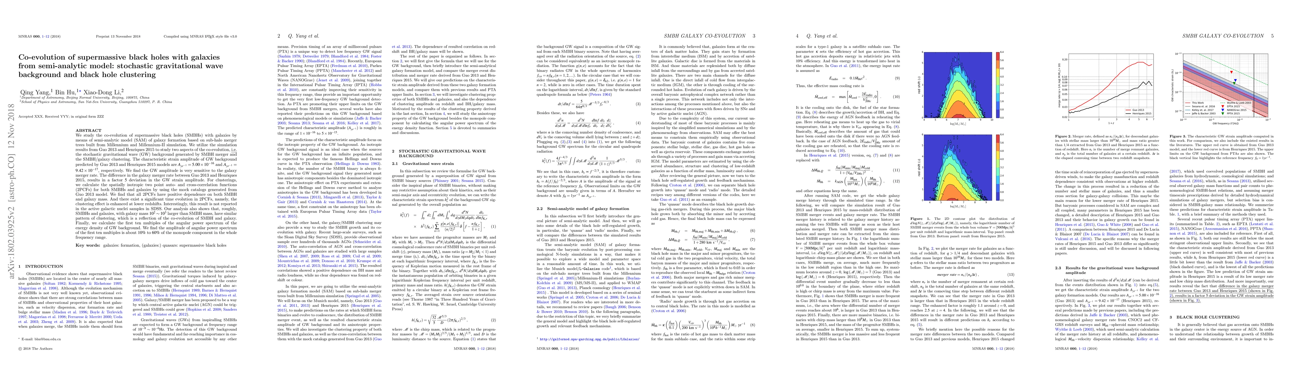 We study the co-evolution of supermassive black holes (SMBHs) with galaxies by means of semi-analytic model (SAM) of galaxy formation based on sub-halo merger trees built from Millennium and Millennium-II simulation. We utilize the simulation results from Guo 2013 and Henriques 2015 to study two aspects of the co-evolution, \emph{i.e.} the stochastic gravitational wave (GW) background generated by SMBH merger and the SMBH/galaxy clustering. The characteristic strain amplitude of GW background predicted by Guo 2013 and Henriques 2015 models are $A_{yr^{-1}}=5.00\times10^{-16}$ and $A_{yr^{-1}}=9.42\times10^{-17}$, respectively. We find the GW amplitude is very sensitive to the galaxy merger rate. The difference in the galaxy merger rate between Guo 2013 and Henriques 2015, results in a factor $5$ deviation in the GW strain amplitude. For clusterings, we calculate the spatially isotropic two point auto- and cross-correlation functions (2PCFs) for both SMBHs and galaxies by using the mock catalogs generated from Guo 2013 model. We find that all 2PCFs have positive dependence on both SMBH and galaxy mass. And there exist a significant time evolution in 2PCFs, namely, the clustering effect is enhanced at lower redshifts. Interestingly, this result is not reported in the active galactic nuclei samples in SDSS. Our analysis also shows that, roughly, SMBHs and galaxies, with galaxy mass $10^2\sim10^3$ larger than SMBH mass, have similar pattern of clustering, which is a reflection of the co-evolution of SMBH and galaxy. Finally, we calculate the first ten multiples of the angular power spectrum of the energy density of GW background. We find the amplitude of angular power spectrum of the first ten multiples is about $10\%$ to $60\%$ of the monopole component in the whole frequency range.