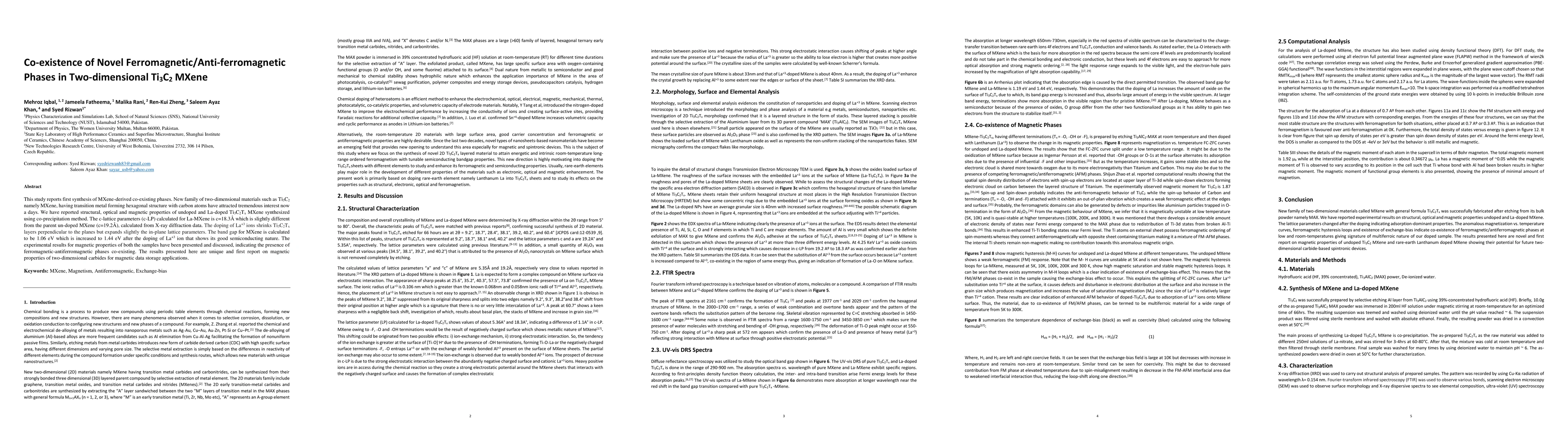 This study synthesizes undoped and La-doped Ti3C2Tx MXene, revealing co-existing ferromagnetic and antiferromagnetic phases. The La-doping alters lattice parameters and increases the band gap, indicating potential for magnetic data storage applications.
