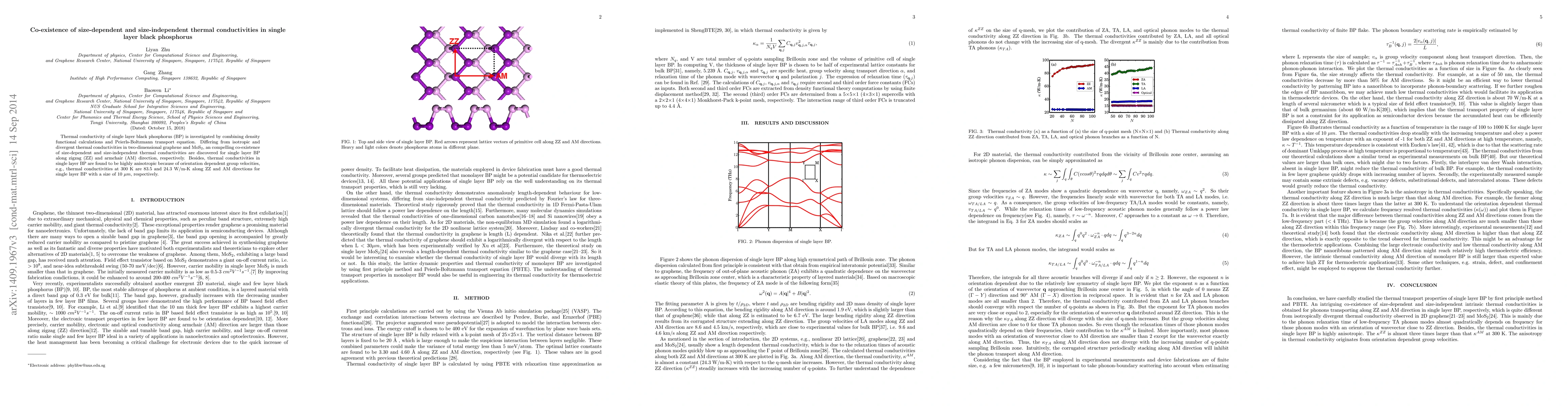 This study reveals the coexistence of size-dependent and size-independent thermal conductivities in single layer black phosphorus (BP), with significant anisotropy along zigzag and armchair directions due to orientation-dependent group velocities. The thermal conductivity values at 300 K differ greatly, being 83.5 W/m-K along zigzag and 24.3 W/m-K along armchair directions.