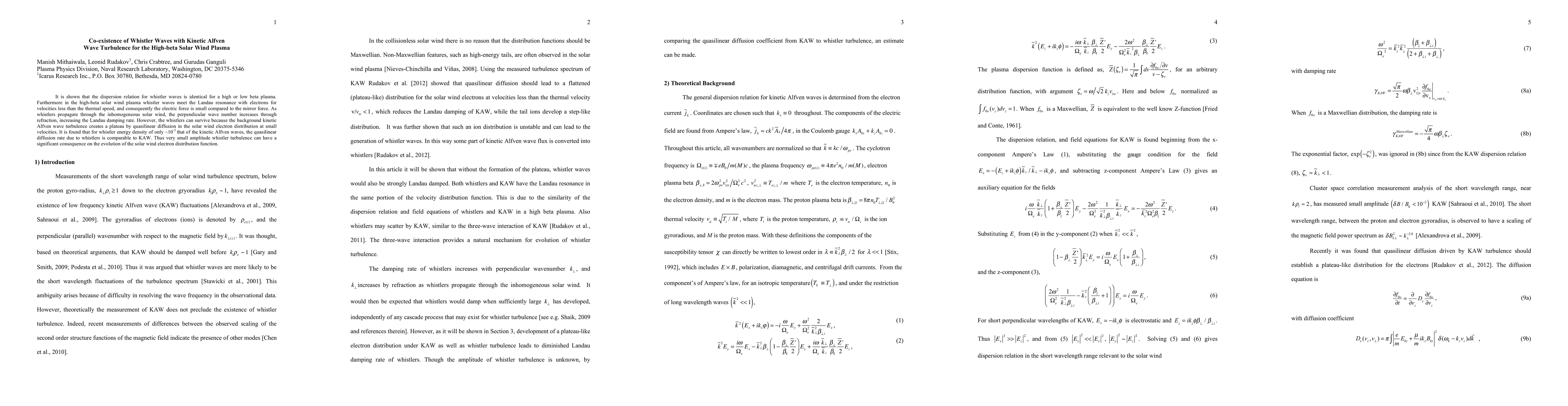 It is shown that the dispersion relation for whistler waves is identical for a high or low beta plasma. Furthermore in the high-beta solar wind plasma whistler waves meet the Landau resonance with electrons for velocities less than the thermal speed, and consequently the electric force is small compared to the mirror force. As whistlers propagate through the inhomogeneous solar wind, the perpendicular wave number increases through refraction, increasing the Landau damping rate. However, the whistlers can survive because the background kinetic Alfven wave turbulence creates a plateau by quasilinear diffusion in the solar wind electron distribution at small velocities. It is found that for whistler energy density of only ~10^-3 that of the kinetic Alfven waves, the quasilinear diffusion rate due to whistlers is comparable to KAW. Thus very small amplitude whistler turbulence can have a significant consequence on the evolution of the solar wind electron distribution function.