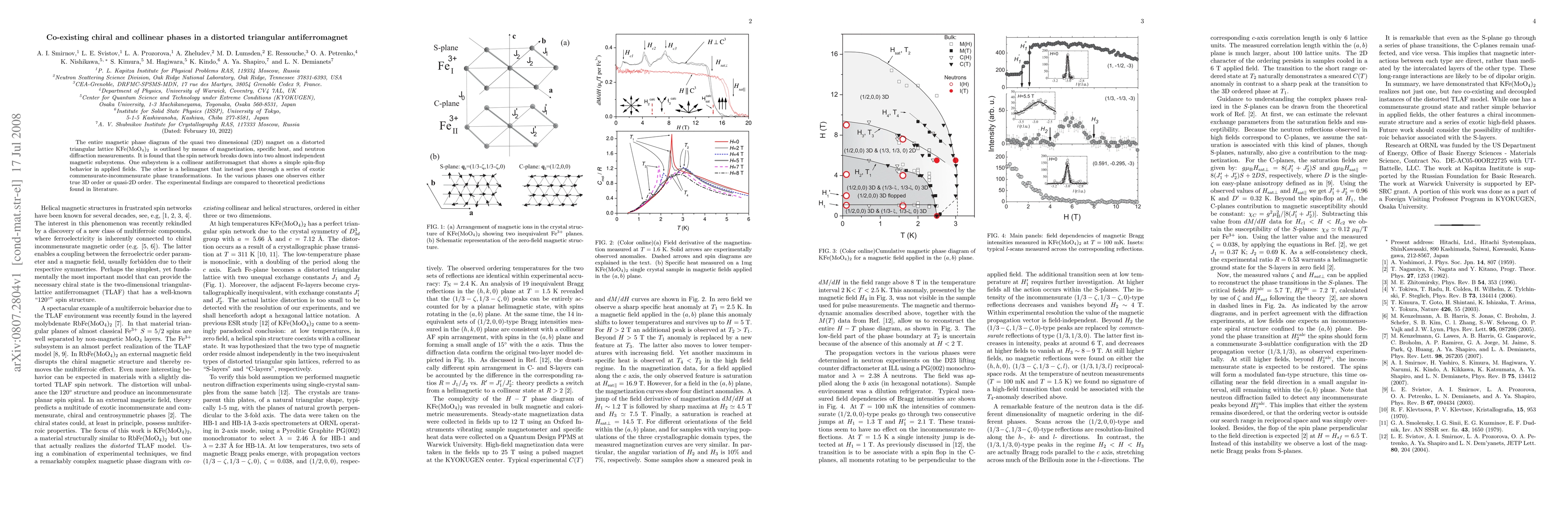 The entire magnetic phase diagram of the quasi two dimensional (2D) magnet on a distorted triangular lattice KFe(MoO4)2 is outlined by means of magnetization, specific heat, and neutron diffraction measurements. It is found that the spin network breaks down into two almost independent magnetic subsystems. One subsystem is a collinear antiferromagnet that shows a simple spin-flop behavior in applied fields. The other is a helimagnet that instead goes through a series of exotic commensurate-incommensurate phase transformations. In the various phases one observes either true 3D order or quasi-2D order. The experimental findings are compared to theoretical predictions found in literature