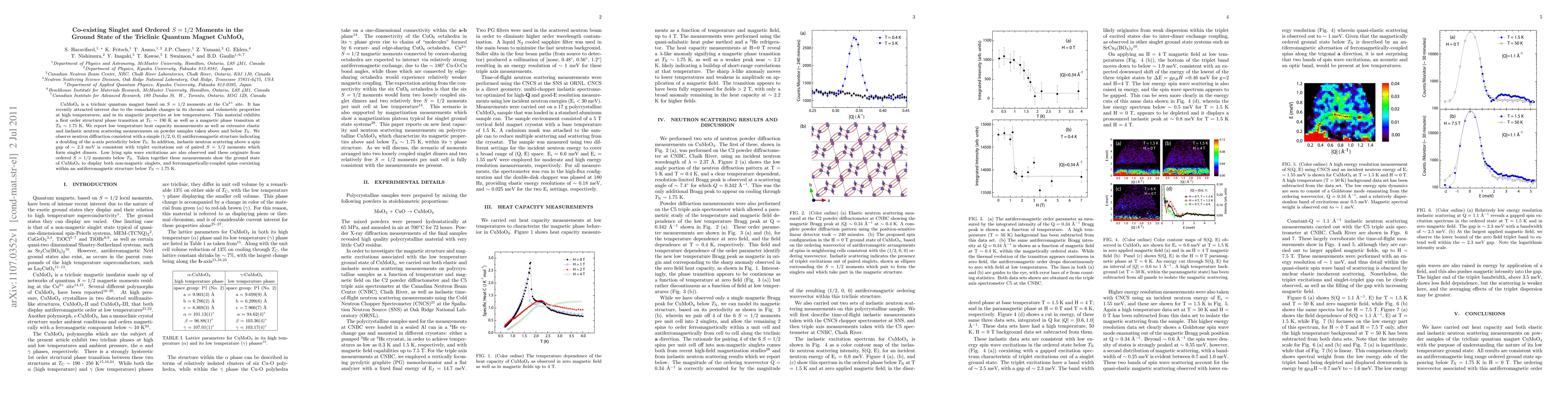 The study of CuMoO4, a triclinic quantum magnet, reveals coexistence of both non-magnetic singlets and ferromagnetically-coupled S=1/2 moments in its antiferromagnetic structure below T_N ~ 1.75 K. This was determined through heat capacity measurements, elastic and inelastic neutron scattering, observing a spin gap and low lying spin wave excitations.