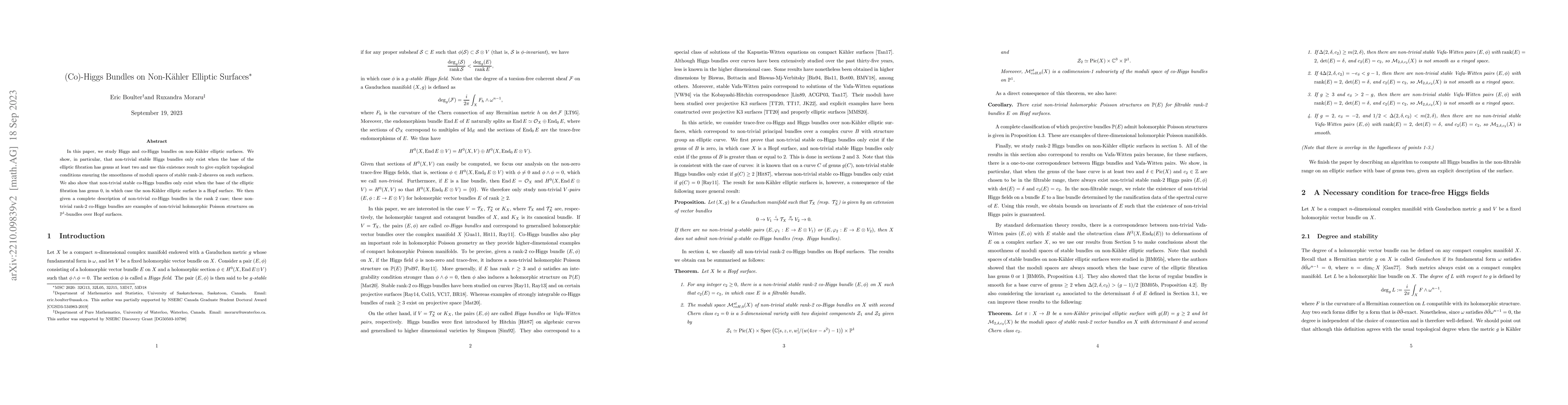 This paper investigates Higgs and co-Higgs bundles on non-Kähler elliptic surfaces, demonstrating that non-trivial stable Higgs bundles exist when the elliptic fibration base has genus at least two. It provides topological conditions for the smoothness of moduli spaces of rank-2 sheaves and shows that non-trivial stable co-Higgs bundles exist only for genus 0 bases, describing these as holomorphic Poisson structures on $\mathbb{P}^1$-bundles over Hopf surfaces.