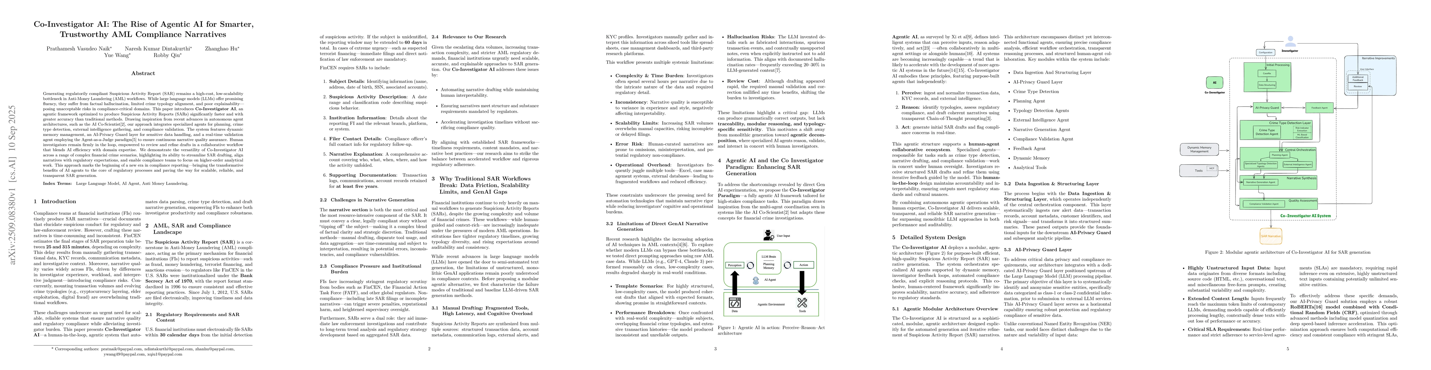 Generating regulatorily compliant Suspicious Activity Report (SAR) remains a high-cost, low-scalability bottleneck in Anti-Money Laundering (AML) workflows. While large language models (LLMs) offer promising fluency, they suffer from factual hallucination, limited crime typology alignment, and poor explainability -- posing unacceptable risks in compliance-critical domains. This paper introduces Co-Investigator AI, an agentic framework optimized to produce Suspicious Activity Reports (SARs) significantly faster and with greater accuracy than traditional methods. Drawing inspiration from recent advances in autonomous agent architectures, such as the AI Co-Scientist, our approach integrates specialized agents for planning, crime type detection, external intelligence gathering, and compliance validation. The system features dynamic memory management, an AI-Privacy Guard layer for sensitive data handling, and a real-time validation agent employing the Agent-as-a-Judge paradigm to ensure continuous narrative quality assurance. Human investigators remain firmly in the loop, empowered to review and refine drafts in a collaborative workflow that blends AI efficiency with domain expertise. We demonstrate the versatility of Co-Investigator AI across a range of complex financial crime scenarios, highlighting its ability to streamline SAR drafting, align narratives with regulatory expectations, and enable compliance teams to focus on higher-order analytical work. This approach marks the beginning of a new era in compliance reporting -- bringing the transformative benefits of AI agents to the core of regulatory processes and paving the way for scalable, reliable, and transparent SAR generation.