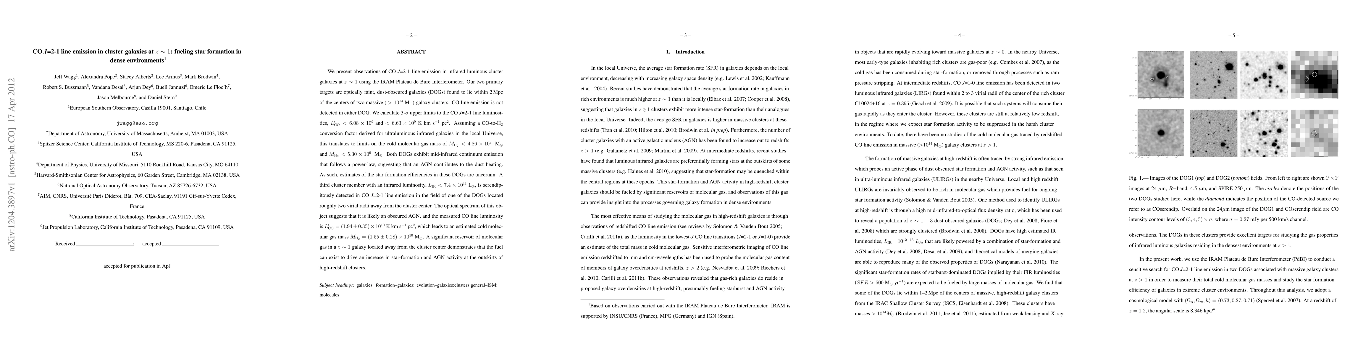Observations of CO J=2-1 line emission in infrared-luminous cluster galaxies at z~1 reveal no significant cold molecular gas, but a serendipitous detection suggests a reservoir of fuel for star formation and AGN activity at the outskirts of high-redshift clusters.