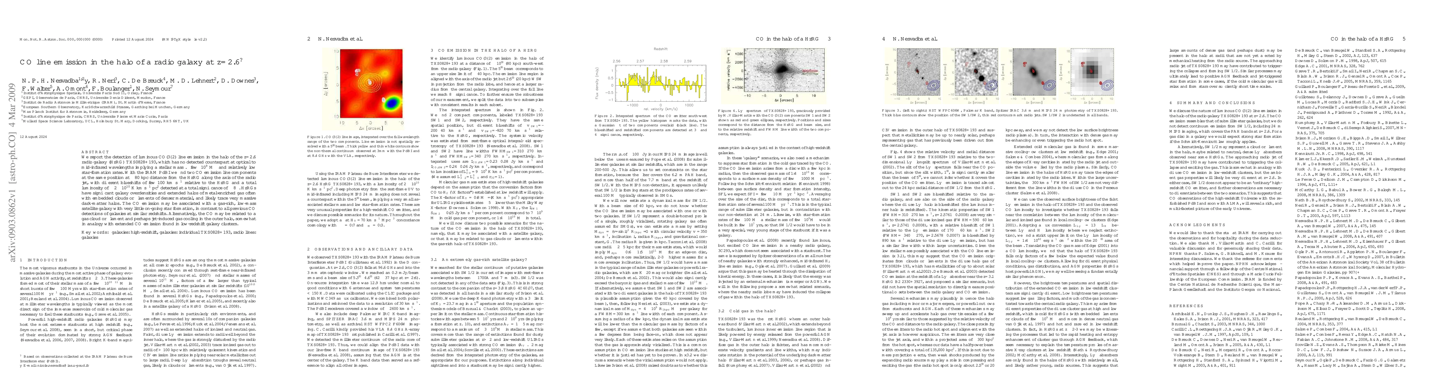 This paper reports the detection of luminous CO(3-2) line emission in the halo of the z=2.6 radio galaxy TXS0828+193, revealing two components with different blueshifts and a total luminosity of ~2x10^10 K km s^-1 pc^2. The CO emission may indicate a gas-rich, low-mass satellite galaxy or a gas cloud/filament in the outer halo, suggesting unique characteristics compared to other galaxies at similar redshifts.