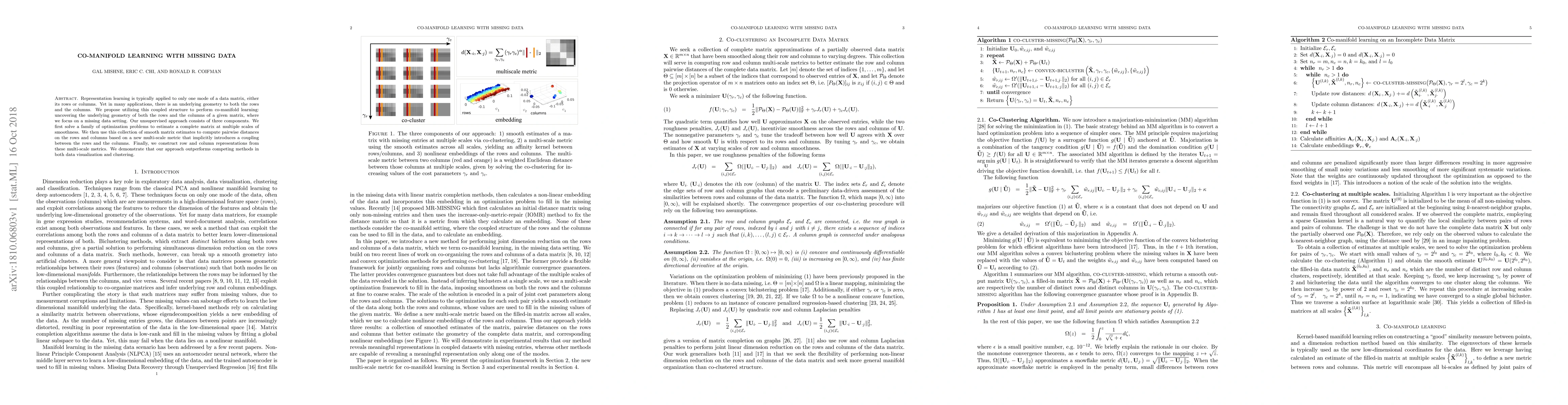 Representation learning is typically applied to only one mode of a data matrix, either its rows or columns. Yet in many applications, there is an underlying geometry to both the rows and the columns. We propose utilizing this coupled structure to perform co-manifold learning: uncovering the underlying geometry of both the rows and the columns of a given matrix, where we focus on a missing data setting. Our unsupervised approach consists of three components. We first solve a family of optimization problems to estimate a complete matrix at multiple scales of smoothness. We then use this collection of smooth matrix estimates to compute pairwise distances on the rows and columns based on a new multi-scale metric that implicitly introduces a coupling between the rows and the columns. Finally, we construct row and column representations from these multi-scale metrics. We demonstrate that our approach outperforms competing methods in both data visualization and clustering.