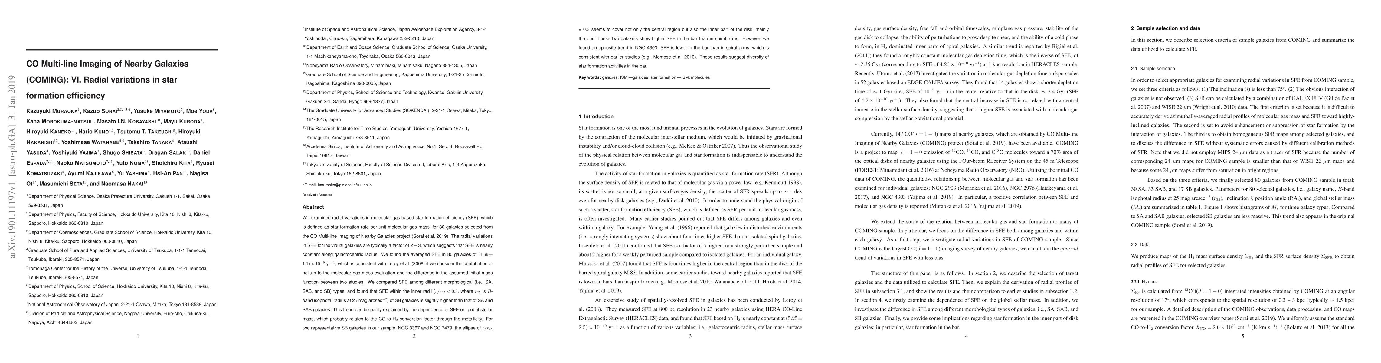 We examined radial variations in molecular-gas based star formation efficiency (SFE), which is defined as star formation rate per unit molecular gas mass, for 80 galaxies selected from the CO Multi-line Imaging of Nearby Galaxies project (Sorai et al. 2019). The radial variations in SFE for individual galaxies are typically a factor of 2 -- 3, which suggests that SFE is nearly constant along galactocentric radius. We found the averaged SFE in 80 galaxies of $(1.69 \pm 1.1) \times 10^{-9}$ yr$^{-1}$, which is consistent with Leroy et al. 2008 if we consider the contribution of helium to the molecular gas mass evaluation and the difference in the assumed initial mass function between two studies. We compared SFE among different morphological (i.e., SA, SAB, and SB) types, and found that SFE within the inner radii ($r/r_{25} < 0.3$, where $r_{25}$ is $B$-band isophotal radius at 25 mag arcsec$^{-2}$) of SB galaxies is slightly higher than that of SA and SAB galaxies. This trend can be partly explained by the dependence of SFE on global stellar mass, which probably relates to the CO-to-H$_2$ conversion factor through the metallicity. For two representative SB galaxies in our sample, NGC 3367 and NGC 7479, the ellipse of $r/r_{25}$ = 0.3 seems to cover not only the central region but also the inner part of the disk, mainly the bar. These two galaxies show higher SFE in the bar than in spiral arms. However, we found an opposite trend in NGC 4303; SFE is lower in the bar than in spiral arms, which is consistent with earlier studies (e.g., Momose et al. 2010). These results suggest diversity of star formation activities in the bar.