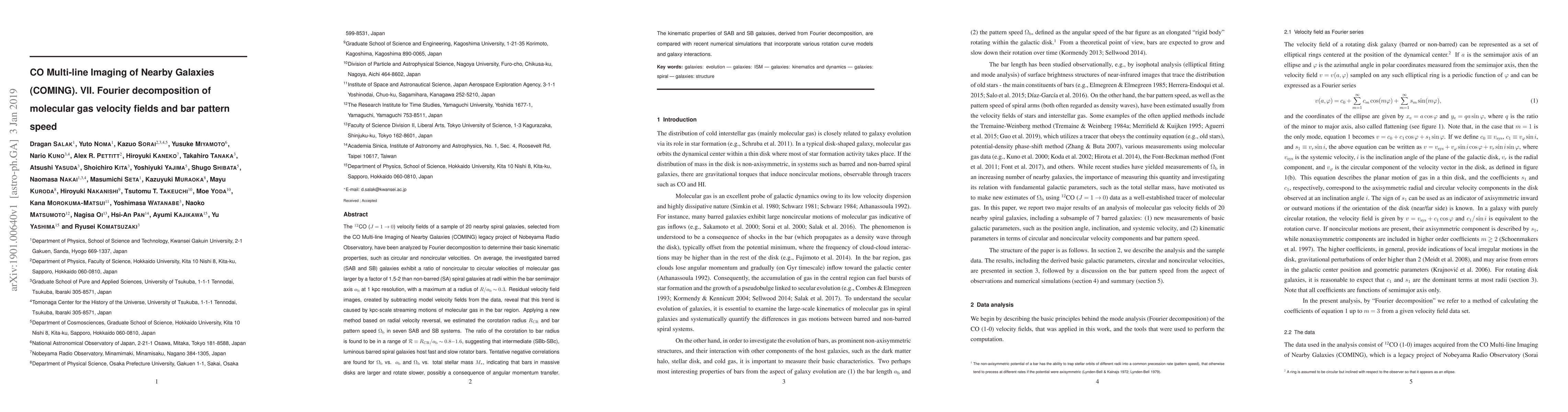 The $^{12}$CO $(J=1\rightarrow0)$ velocity fields of a sample of 20 nearby spiral galaxies, selected from the CO Multi-line Imaging of Nearby Galaxies (COMING) legacy project of Nobeyama Radio Observatory, have been analyzed by Fourier decomposition to determine their basic kinematic properties, such as circular and noncircular velocities. On average, the investigated barred (SAB and SB) galaxies exhibit a ratio of noncircular to circular velocities of molecular gas larger by a factor of 1.5-2 than non-barred (SA) spiral galaxies at radii within the bar semimajor axis $a_\mathrm{b}$ at 1 kpc resolution, with a maximum at a radius of $R/a_\mathrm{b}\sim0.3$. Residual velocity field images, created by subtracting model velocity fields from the data, reveal that this trend is caused by kpc-scale streaming motions of molecular gas in the bar region. Applying a new method based on radial velocity reversal, we estimated the corotation radius $R_\mathrm{CR}$ and bar pattern speed $\Omega_\mathrm{b}$ in seven SAB and SB systems. The ratio of the corotation to bar radius is found to be in a range of $\mathcal{R}\equiv R_\mathrm{CR}/a_\mathrm{b}\sim0.8\mathrm{-}1.6$, suggesting that intermediate (SBb-SBc), luminous barred spiral galaxies host fast and slow rotator bars. Tentative negative correlations are found for $\Omega_\mathrm{b}$ vs. $a_\mathrm{b}$ and $\Omega_\mathrm{b}$ vs. total stellar mass $M_\ast$, indicating that bars in massive disks are larger and rotate slower, possibly a consequence of angular momentum transfer. The kinematic properties of SAB and SB galaxies, derived from Fourier decomposition, are compared with recent numerical simulations that incorporate various rotation curve models and galaxy interactions.