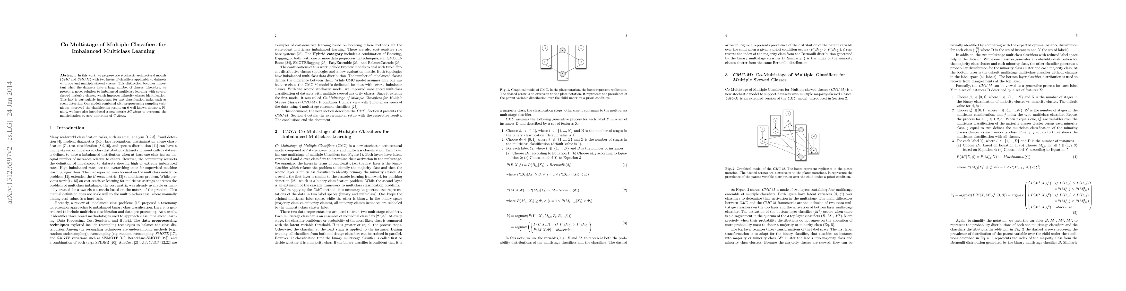 In this work, we propose two stochastic architectural models (CMC and CMC-M) with two layers of classifiers applicable to datasets with one and multiple skewed classes. This distinction becomes important when the datasets have a large number of classes. Therefore, we present a novel solution to imbalanced multiclass learning with several skewed majority classes, which improves minority classes identification. This fact is particularly important for text classification tasks, such as event detection. Our models combined with pre-processing sampling techniques improved the classification results on six well-known datasets. Finally, we have also introduced a new metric SG-Mean to overcome the multiplication by zero limitation of G-Mean.