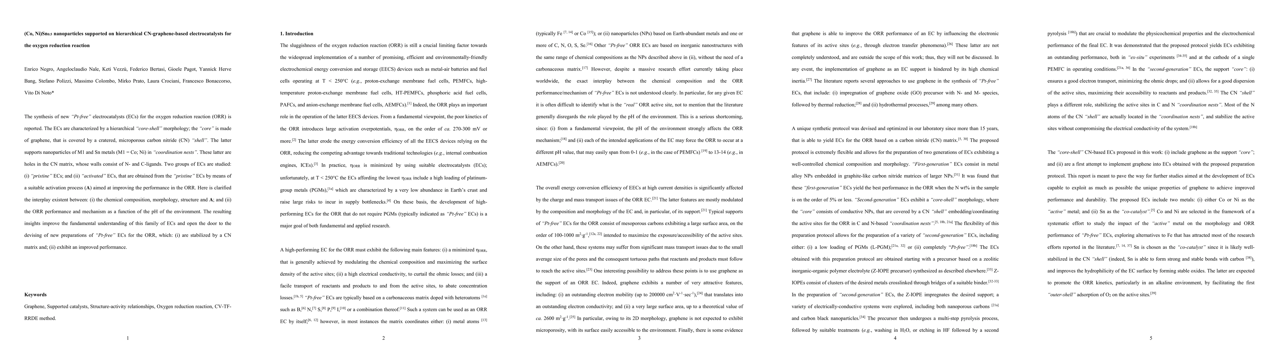 The synthesis of new 'Pt-free' electrocatalysts (ECs) for the oxygen reduction reaction (ORR) is reported. The ECs are characterized by a hierarchical 'core-shell' morphology; the 'core' is made of graphene, that is covered by a cratered, microporous carbon nitride (CN) 'shell'. The latter supports nanoparticles of M1 and Sn metals (M1 = Co; Ni) in 'coordination nests'. These latter are holes in the CN matrix, whose walls consist of N- and C-ligands. Two groups of ECs are studied: (i) 'pristine' ECs; and (ii) 'activated' ECs, that are obtained from the 'pristine' ECs by means of a suitable activation process (A) aimed at improving the performance in the ORR. Here is clarified the interplay existent between: (i) the chemical composition, morphology, structure and A; and (ii) the ORR performance and mechanism as a function of the pH of the environment. The resulting insights improve the fundamental understanding of this family of ECs and open the door to the devising of new preparations of 'Pt-free' ECs for the ORR, which: (i) are stabilized by a CN matrix and; (ii) exhibit an improved performance.