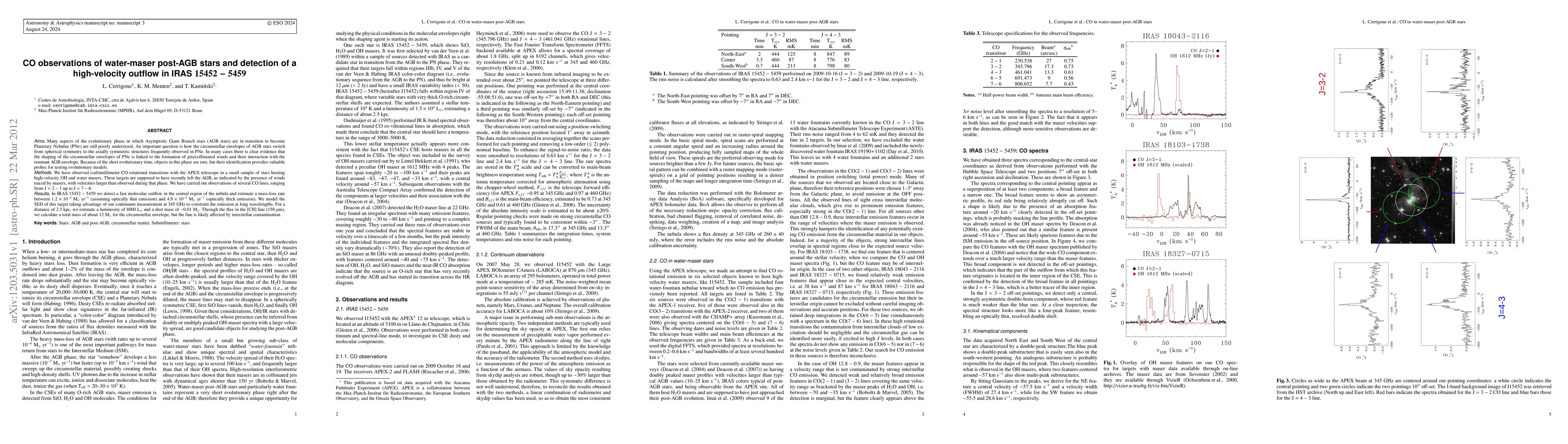 Many aspects of the evolutionary phase in which Asymptotic Giant Branch stars (AGB stars) are in transition to become Planetary Nebulae (PNe) are still poorly understood. An important question is how the circumstellar envelopes of AGB stars switch from spherical symmetry to the axially symmetric structures frequently observed in PNe. In many cases there is clear evidence that the shaping of the circumstellar envelopes of PNe is linked to the formation of jets/collimated winds and their interaction with the remnant AGB envelope. Because of the short evolutionary time, objects in this phase are rare, but their identification provides valuable probes for testing evolutionary models. We have observed (sub)millimeter CO rotational transitions with the APEX telescope in a small sample of stars hosting high-velocity OH and water masers. These targets are supposed to have recently left the AGB, as indicated by the presence of winds traced by masers, with velocities larger than observed during that phase. We have carried out observations of several CO lines, ranging from J=2-1 up to J=7-6. In IRAS 15452-5459 we detect a fast molecular outflow in the central region of the nebula and estimate a mass-loss rate between 1.2x10^{-4} Msun yr^{-1} (assuming optically thin emission) and 4.9x10^{-4} Msun yr^{-1} (optically thick emission). We model the SED of this target taking advantage of our continuum measurement at 345 GHz to constrain the emission at long wavelengths. For a distance of 2.5 kpc, we estimate a luminosity of 8000 Lsun and a dust mass of 0.01 Msun. Through the flux in the [CII] line (158 um), we calculate a total mass of about 12 Msun for the circumstellar envelope, but the line is likely affected by interstellar contamination.