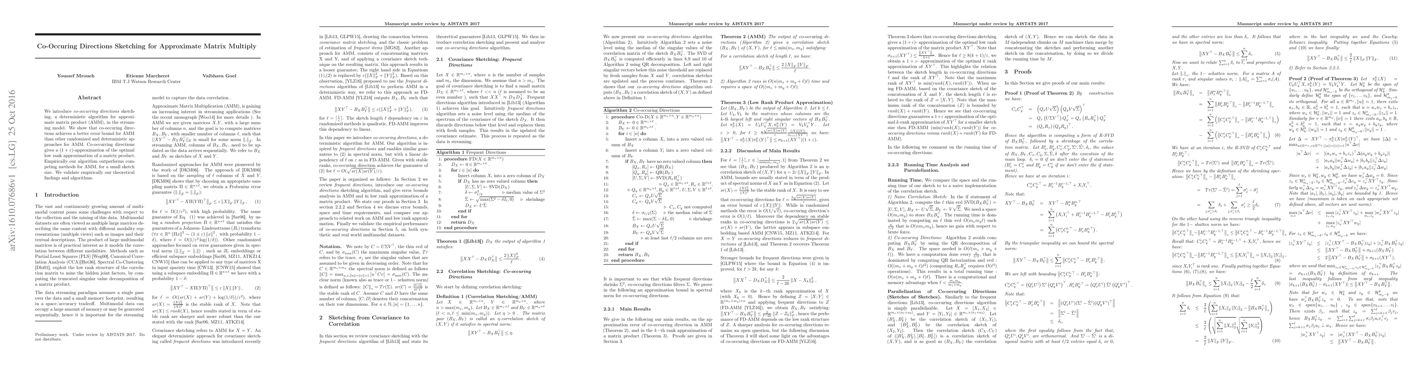 Title: Co-Occuring Directions Sketching for Approximate Matrix Multiply Summary: This paper introduces co-occurring directions sketching, a deterministic algorithm for approximate matrix multiplication in the streaming model, which achieves a better error bound compared to other methods, providing a $1 + \epsilon$ approximation with empirical performance outperforming competitors.