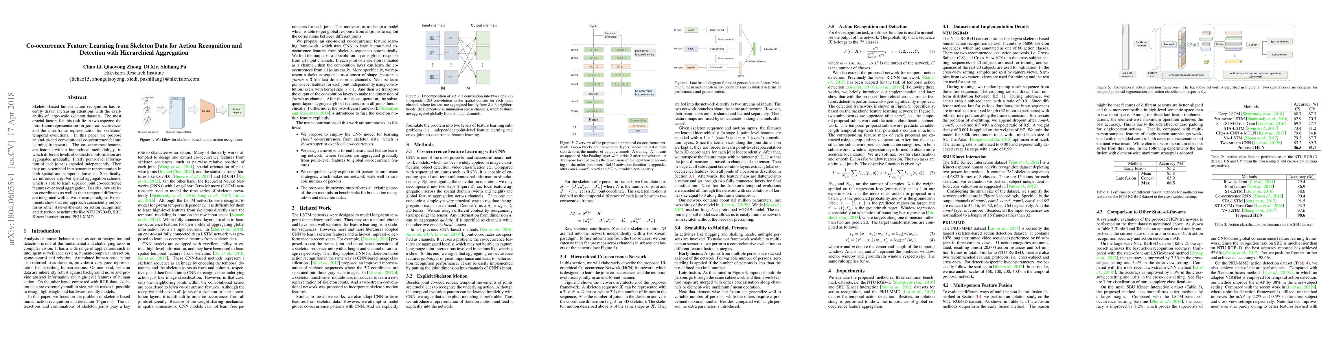 Skeleton-based human action recognition has recently drawn increasing attentions with the availability of large-scale skeleton datasets. The most crucial factors for this task lie in two aspects: the intra-frame representation for joint co-occurrences and the inter-frame representation for skeletons' temporal evolutions. In this paper we propose an end-to-end convolutional co-occurrence feature learning framework. The co-occurrence features are learned with a hierarchical methodology, in which different levels of contextual information are aggregated gradually. Firstly point-level information of each joint is encoded independently. Then they are assembled into semantic representation in both spatial and temporal domains. Specifically, we introduce a global spatial aggregation scheme, which is able to learn superior joint co-occurrence features over local aggregation. Besides, raw skeleton coordinates as well as their temporal difference are integrated with a two-stream paradigm. Experiments show that our approach consistently outperforms other state-of-the-arts on action recognition and detection benchmarks like NTU RGB+D, SBU Kinect Interaction and PKU-MMD.