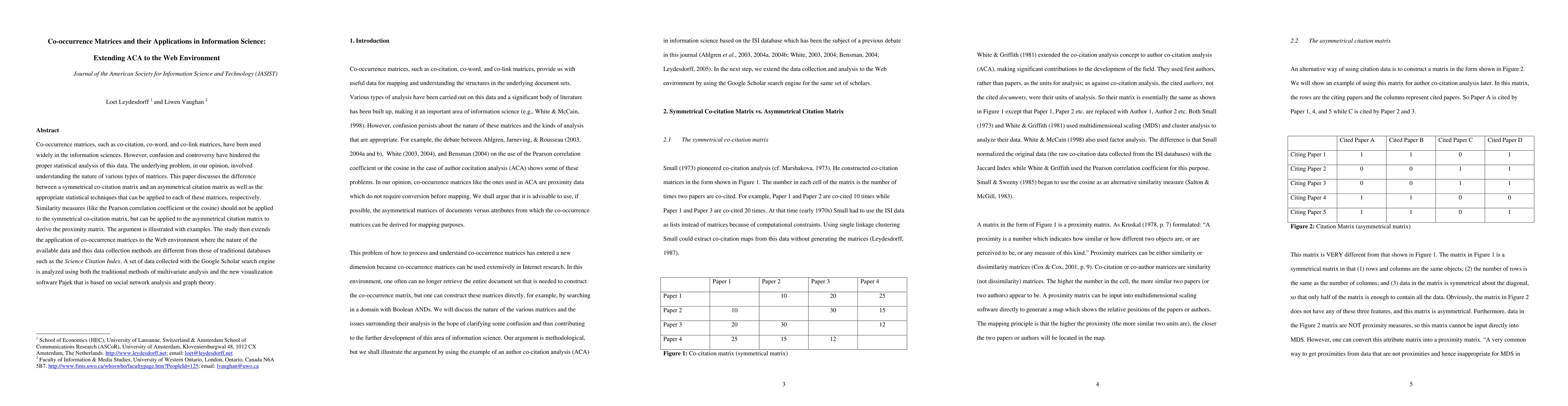 This paper clarifies the distinctions between symmetrical co-citation matrices and asymmetrical citation matrices, advocating for appropriate statistical techniques for each. It extends co-occurrence matrix applications to the web environment, analyzing data from Google Scholar using traditional multivariate analysis and new visualization software Pajek based on social network analysis.