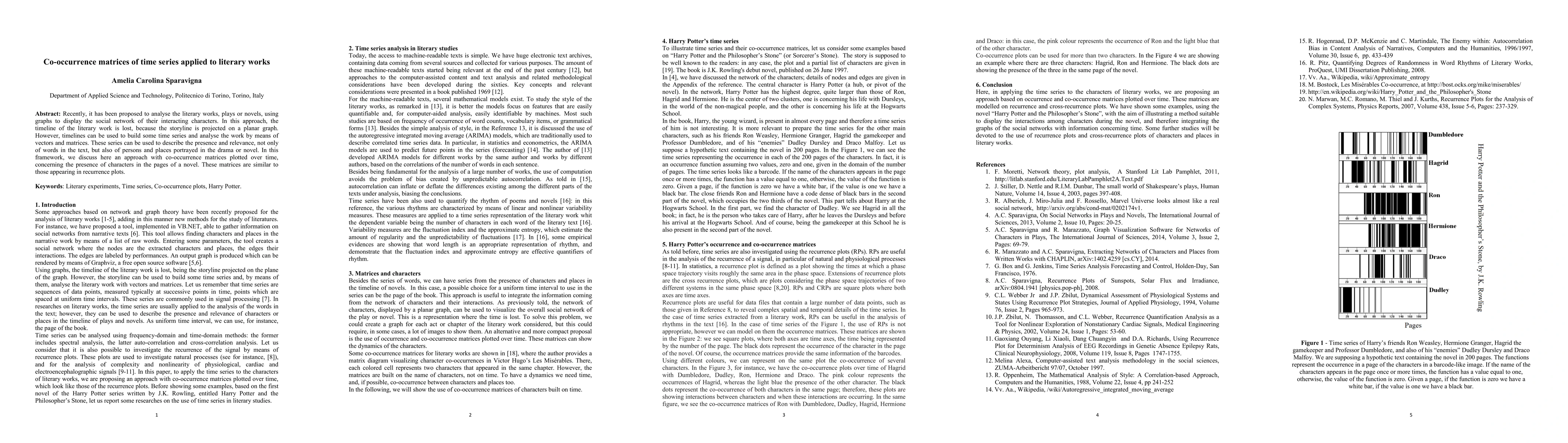 Recently, it has been proposed to analyse the literary works, plays or novels, using graphs to display the social network of their interacting characters. In this approach, the timeline of the literary work is lost, because the storyline is projected on a planar graph. However, timelines can be used to build some time series and analyse the work by means of vectors and matrices. These series can be used to describe the presence and relevance, not only of words in the text, but also of persons and places portrayed in the drama or novel. In this framework, we discuss here an approach with co-occurrence matrices plotted over time, concerning the presence of characters in the pages of a novel. These matrices are similar to those appearing in recurrence plots.