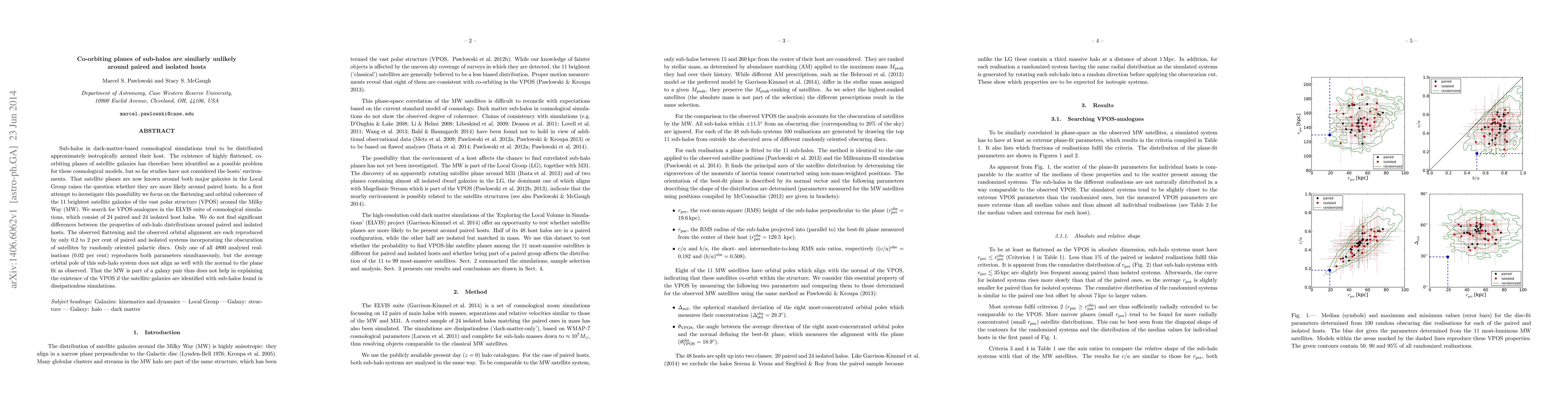 Sub-halos in dark-matter-based cosmological simulations tend to be distributed approximately isotropically around their host. The existence of highly flattened, co-orbiting planes of satellite galaxies has therefore been identified as a possible problem for these cosmological models, but so far studies have not considered the hosts' environments. That satellite planes are now known around both major galaxies in the Local Group raises the question whether they are more likely around paired hosts. In a first attempt to investigate this possibility we focus on the flattening and orbital coherence of the 11 brightest satellite galaxies of the vast polar structure (VPOS) around the Milky Way (MW). We search for VPOS analogs in the ELVIS suite of cosmological simulations, which consist of 24 paired and 24 isolated host halos. We do not find significant differences between the properties of sub-halo distributions around paired and isolated hosts. The observed flattening and the observed orbital alignment are each reproduced by only 0.2 to 2 per cent of paired and isolated systems incorporating the obscuration of satellites by randomly oriented galactic discs. Only one of all 4800 analyzed realizations (0.02 per cent) reproduces both parameters simultaneously, but the average orbital pole of this sub-halo system does not align as well with the normal to the plane fit as observed. That the MW is part of a galaxy pair thus does not help in explaining the existence of the VPOS if the satellite galaxies are identified with sub-halos found in dissipationless simulations.