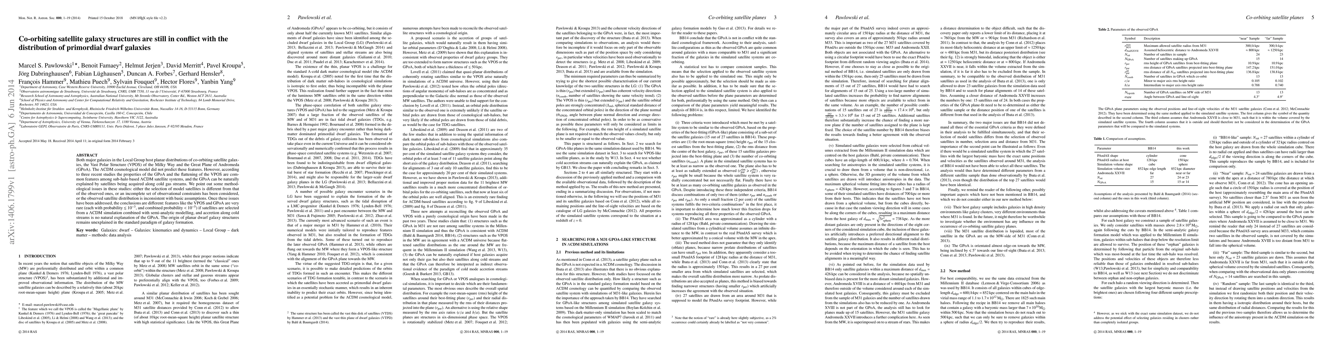 This paper discusses the unexpected planar distributions of co-orbiting satellite galaxies around major galaxies in the Local Group, highlighting conflicts with predictions from the $\Lambda$CDM cosmological model. Despite recent studies suggesting these features can be explained by satellite accretion along cold gas streams, the authors point out methodological issues that lead to the conclusion that such features are rare and their origin remains unexplained within the standard galaxy formation paradigm.