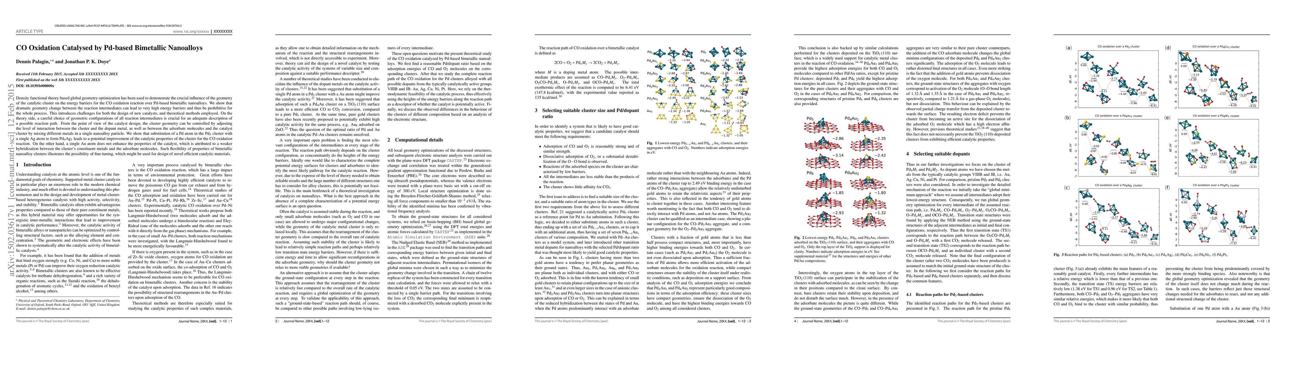 Density functional theory based global geometry optimization has been used to demonstrate the crucial influence of the geometry of the catalytic cluster on the energy barriers for the CO oxidation reaction over Pd-based bimetallic nanoalloys. We show that dramatic geometry change between the reaction intermediates can lead to very high energy barriers and thus be prohibitive for the whole process. This introduces challenges for both the design of new catalysts, and theoretical methods employed. On the theory side, a careful choice of geometric configurations of all reaction intermediates is crucial for an adequate description of a possible reaction path. From the point of view of the catalyst design, the cluster geometry can be controlled by adjusting the level of interaction between the cluster and the dopant metal, as well as between the adsorbate molecules and the catalyst cluster by mixing different metals in a single nanoalloy particle. We show that substitution of a Pd atom in the Pd$_{5}$ cluster with a single Ag atom to form Pd$_{4}$Ag$_{1}$ leads to a potential improvement of the catalytic properties of the cluster for the CO oxidation reaction. On the other hand, a single Au atom does not enhance the properties of the catalyst, which is attributed to a weaker hybridization between the cluster's constituent metals and the adsorbate molecules. Such flexibility of properties of bimetallic nanoalloy clusters illustrates the possibility of fine-tuning, which might be used for design of novel efficient catalytic materials.