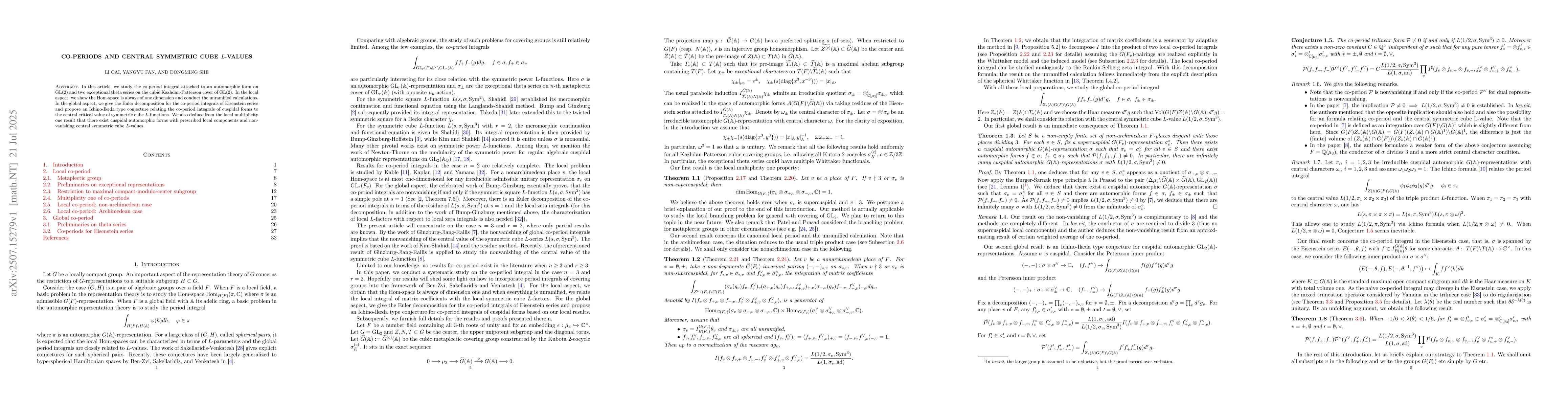 In this article, we study the co-period integral attached to an automorphic form on $\GL(2)$ and two exceptional theta series on the cubic Kazhdan-Patterson cover of $\GL(2)$. In the local aspect, we show the $\Hom$-space is always of one dimension and conduct the unramified calculations. In the global aspect, we give the Euler decomposition for the co-period integrals of Eisenstein series and propose an Ichino-Ikeda type conjecture relating the co-period integrals of cuspidal forms to the central critical value of symmetric cube $L$-functions. We also deduce from the local multiplicity one result that there exist cuspidal automorphic forms with prescribed local components and non-vanishing central symmetric cube $L$-values.