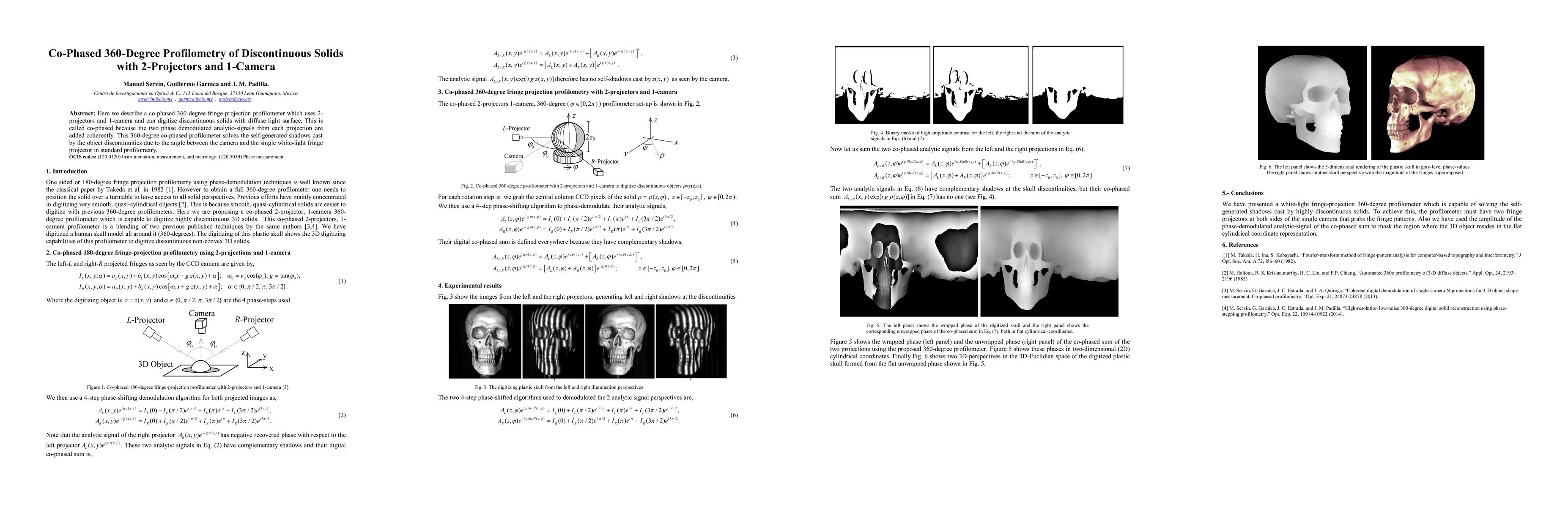 Here we describe a co-phased 360-degree fringe-projection profilometer which uses 2-projectors and 1-camera and can digitize discontinuous solids with diffuse light surface. This is called co-phased because the two phase demodulated analytic-signals from each projection are added coherently. This 360-degree co-phased profilometer solves the self-generated shadows cast by the object discontinuities due to the angle between the camera and the single white-light fringe projector in standard profilometry.