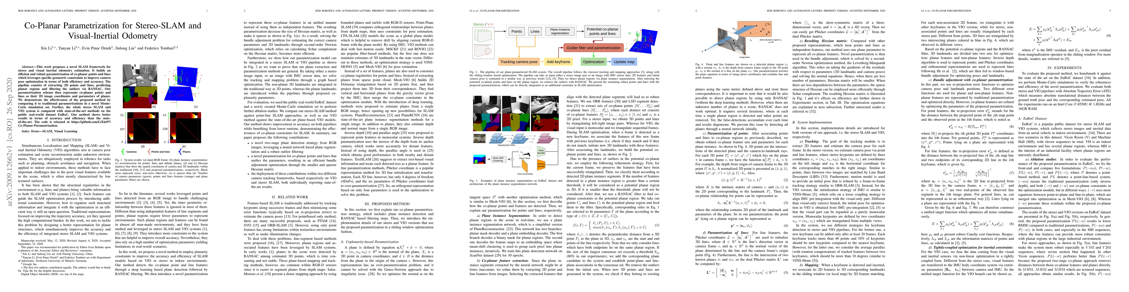 This paper introduces a novel SLAM framework that efficiently and robustly estimates camera pose using stereo and visual-inertial odometry through a co-planar parametrization scheme, which reduces the Hessian matrix size and improves accuracy and efficiency. The method is validated against traditional approaches and state-of-the-art methods on the EuRoC dataset.