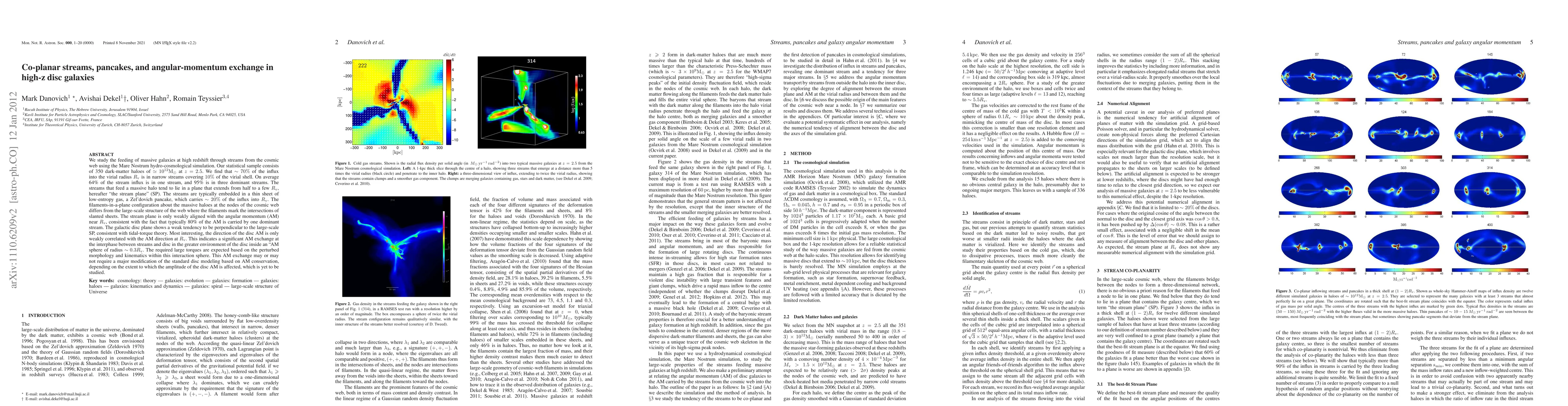 We study the feeding of massive galaxies at high redshift through streams from the cosmic web using the Mare Nostrum hydro-cosmological simulation. Our statistical sample consists of 350 dark-matter haloes of ~10^12 Msun at z = 2.5. We find that ~70% of the influx into the virial radius Rv is in narrow streams covering 10% of the virial shell. On average 64% of the stream influx is in one stream, and 95% is in three dominant streams. The streams that feed a massive halo tend to lie in a plane that extends from half to a few Rv, hereafter "the stream plane" (SP). The streams are typically embedded in a thin sheet of low-entropy gas, a Zel'dovich pancake, which carries ~20% of the influx into Rv. The filaments-in-a-plane configuration about the massive haloes at the nodes of the cosmic web differs from the large- scale structure of the web where the filaments mark the intersections of slanted sheets. The stream plane is only weakly aligned with the angular momentum (AM) near Rv, consistent with the fact that typically 80% of the AM is carried by one dominant stream. The galactic disc plane shows a weak tendency to be perpendicular to the large-scale SP, consistent with tidal-torque theory. Most interesting, the direction of the disc AM is only weakly correlated with the AM direction at Rv. This indicates a significant AM exchange at the interphase between streams and disc in the greater environment of the disc inside an "AM sphere" of radius ~0.3Rv . The required large torques are expected based on the perturbed morphology and kinematics within this interaction sphere. This AM exchange may or may not require a major modification of the standard disc modeling based on AM conservation, depending on the extent to which the amplitude of the disc AM is affected, which is yet to be studied.