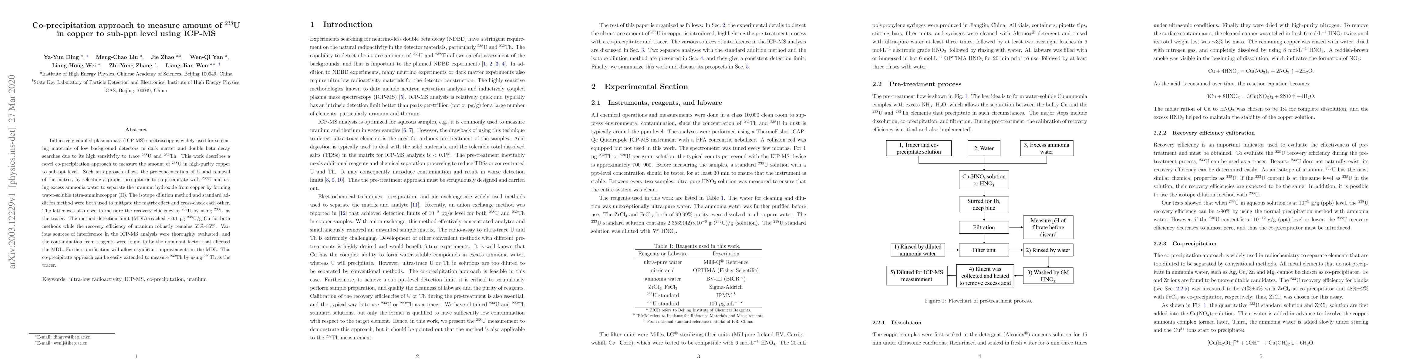 Inductively coupled plasma mass (ICP-MS) spectroscopy is widely used for screening materials of low background detectors in dark matter and double beta decay searches due to its high sensitivity to trace $^{238}$U and $^{232}$Th. This work describes a novel co-precipitation approach to measure the amount of $^{238}$U in high-purity copper to sub-ppt level. Such an approach allows the pre-concentration of U and removal of the matrix, by selecting a proper precipitator to co-precipitate with $^{238}$U and using excess ammonia water to separate the uranium hydroxide from copper by forming water-soluble tetra-amminecopper (II). The isotope dilution method and standard addition method were both used to mitigate the matrix effect and cross-check each other. The latter was also used to measure the recovery efficiency of $^{238}$U by using $^{233}$U as the tracer. The method detection limit (MDL) reached $\sim$0.1 pg $^{238}$U /g Cu for both methods while the recovery efficiency of uranium robustly remains 65\%--85\%. Various sources of interference in the ICP-MS analysis were thoroughly evaluated, and the contamination from reagents were found to be the dominant factor that affected the MDL. Further purification will allow significant improvements in the MDL. This co-precipitate approach can be easily extended to measure $^{232}$Th by using $^{229}$Th as the tracer.