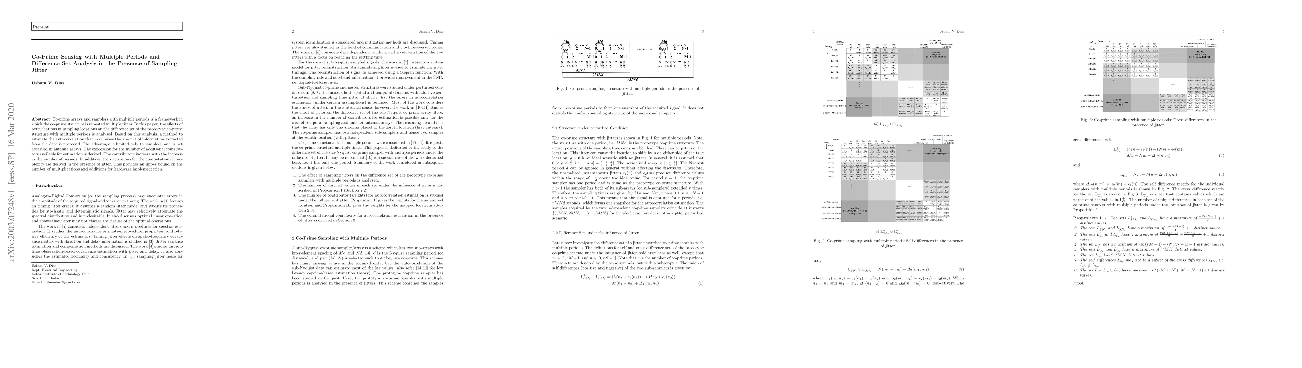 This paper analyzes the impact of sampling jitter on co-prime arrays and samplers with multiple periods, proposing a method to estimate autocorrelation that maximizes information extraction. The derived expressions for additional contributors and computational complexity provide an upper bound on hardware implementation requirements.