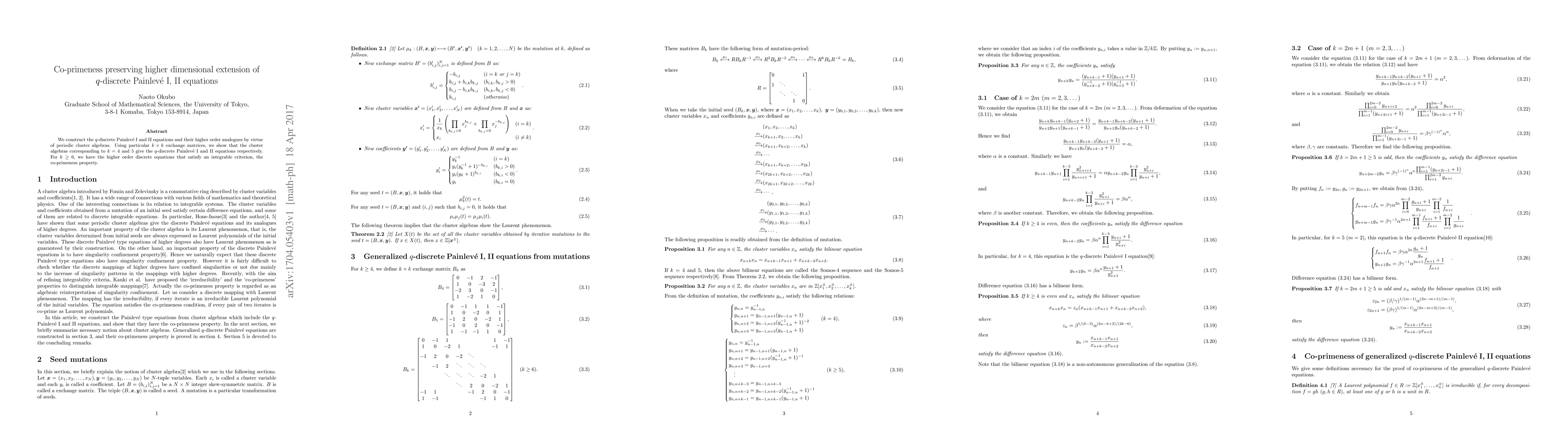 This paper constructs q-discrete versions of Painlevé I and II equations and their higher-order analogues using periodic cluster algebras. It demonstrates that specific (k,k) exchange matrices yield these equations, preserving the co-primeness property in higher dimensions.