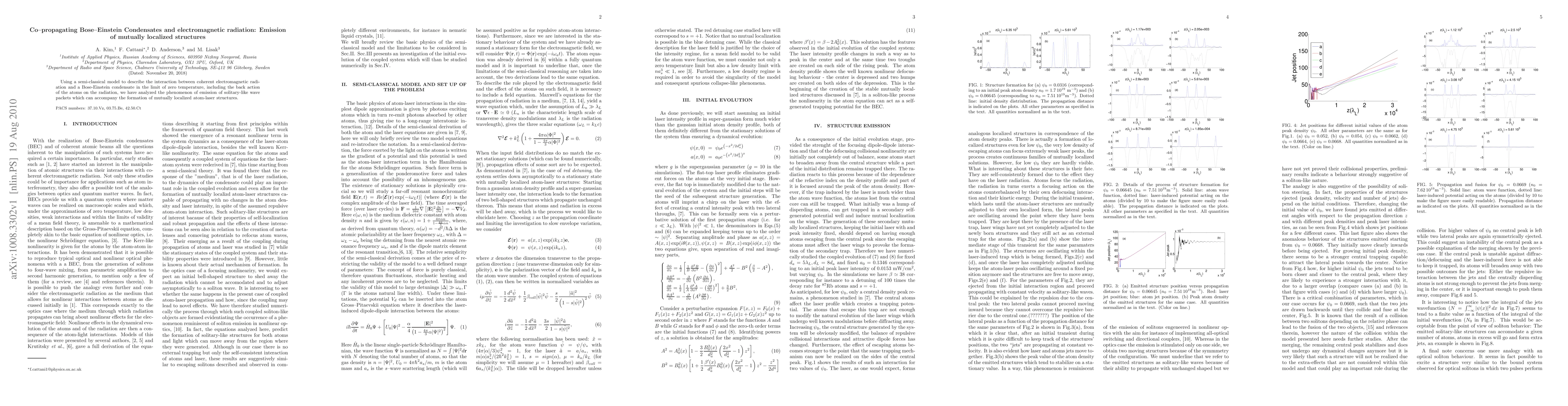 Using a semi-classical model to describe the interaction between coherent electromagnetic radiation and a Bose-Einstein condensate in the limit of zero temperature, including the back action of the atoms on the radiation, we have analyzed the phenomenon of emission of solitary-like wave packets which can accompany the formation of mutually localized atom-laser structures.