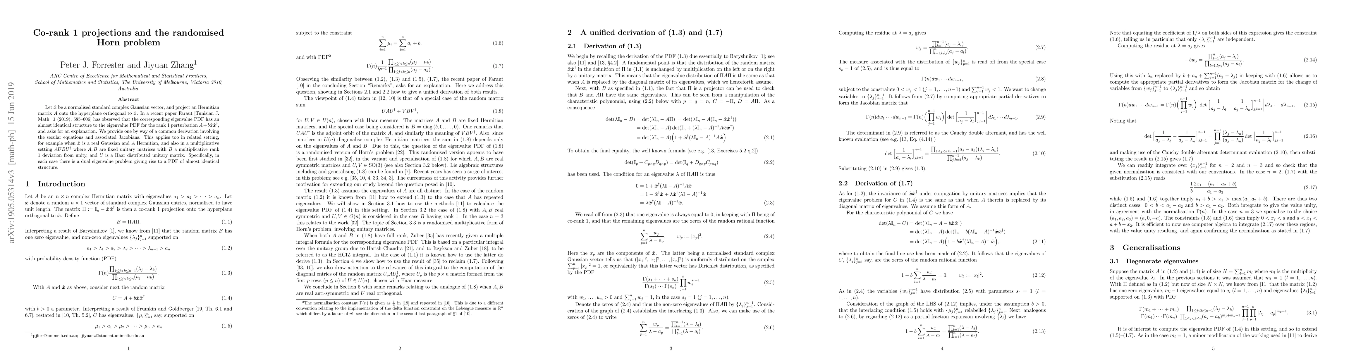 Let $\hat{\boldsymbol x}$ be a normalised standard complex Gaussian vector, and project an Hermitian matrix $A$ onto the hyperplane orthogonal to $\hat{\boldsymbol x}$. In a recent paper Faraut [Tunisian J. Math. \textbf{1} (2019), 585--606] has observed that the corresponding eigenvalue PDF has an almost identical structure to the eigenvalue PDF for the rank 1 perturbation $A + b \hat{\boldsymbol x} \hat{\boldsymbol x}^\dagger$, and asks for an explanation. We provide this by way of a common derivation involving the secular equations and associated Jacobians. This applies too in related setting, for example when $\hat{\boldsymbol x}$ is a real Gaussian and $A$ Hermitian, and also in a multiplicative setting $A U B U^\dagger$ where $A, B$ are fixed unitary matrices with $B$ a multiplicative rank 1 deviation from unity, and $U$ is a Haar distributed unitary matrix. Specifically, in each case there is a dual eigenvalue problem giving rise to a PDF of almost identical structure.