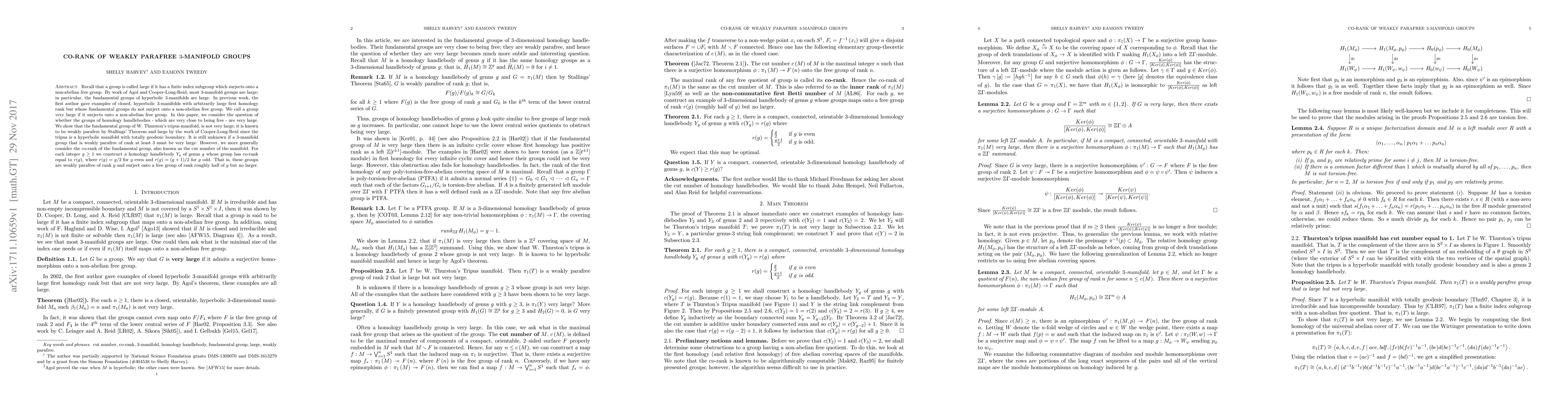 Recall that a group is called large if it has a finite index subgroup which surjects onto a non-abelian free group. By work of Agol and Cooper-Long-Reid, most 3-manifold groups are large; in particular, the fundamental groups of hyperbolic 3-manifolds are large. In previous work, the first author gave examples of closed, hyperbolic 3-manifolds with arbitrarily large first homology rank but whose fundamental groups do not surject onto a non-abelian free group. We call a group very large if it surjects onto a non-abelian free group. In this paper, we consider the question of whether the groups of homology handlebodies - which are very close to being free - are very large. We show that the fundamental group of W. Thurston's tripus manifold, is not very large; it is known to be weakly parafree by Stallings' Theorem and large by the work of Cooper-Long-Reid since the tripus is a hyperbolic manifold with totally geodesic boundary. It is still unknown if a 3-manifold group that is weakly parafree of rank at least 3 must be very large. However, we more generally consider the co-rank of the fundamental group, also known as the cut number of the manifold. For each positive integer g we construct a homology handlebody Y_g of genus g whose group has co-rank equal to r(g), where r(g)=g/2 for g even and r(g)=(g+1)/2 for g odd. That is, these groups are weakly parafree of rank g and surject onto a free group of rank roughly half of g but no larger.