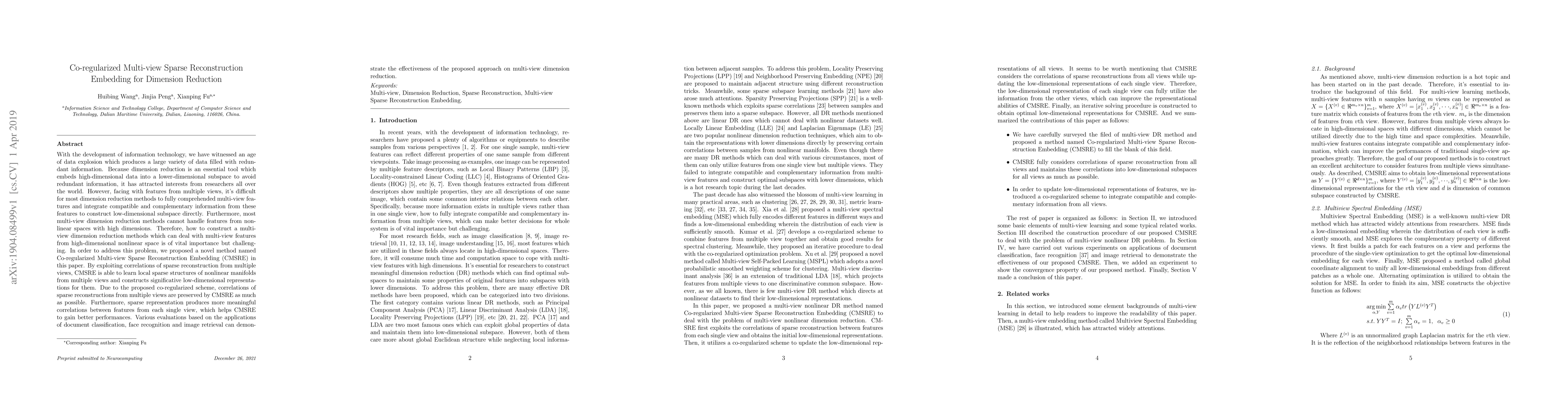 This paper proposes a novel Co-regularized Multi-view Sparse Reconstruction Embedding (CMSRE) method for dimension reduction, addressing the challenge of integrating multi-view features from high-dimensional nonlinear spaces. CMSRE effectively learns and preserves correlations between sparse reconstructions from multiple views, demonstrating improved performance in document classification, face recognition, and image retrieval.