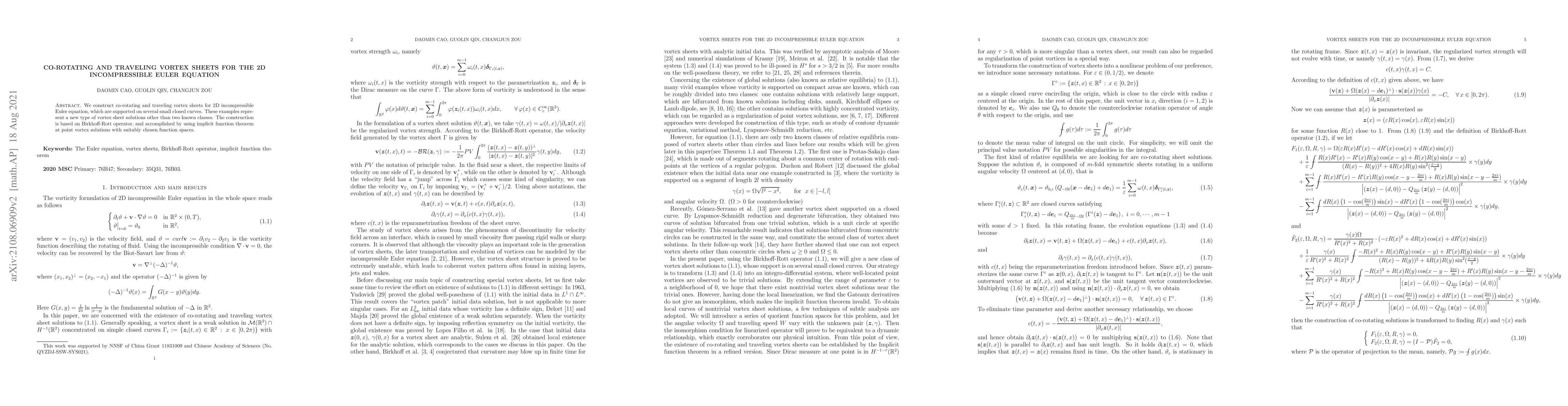 The paper constructs novel co-rotating and traveling vortex sheet solutions for the 2D incompressible Euler equation, utilizing the Birkhoff-Rott operator and implicit function theorem. These solutions, supported on multiple small closed curves, represent a new class of vortex sheet solutions distinct from existing types.