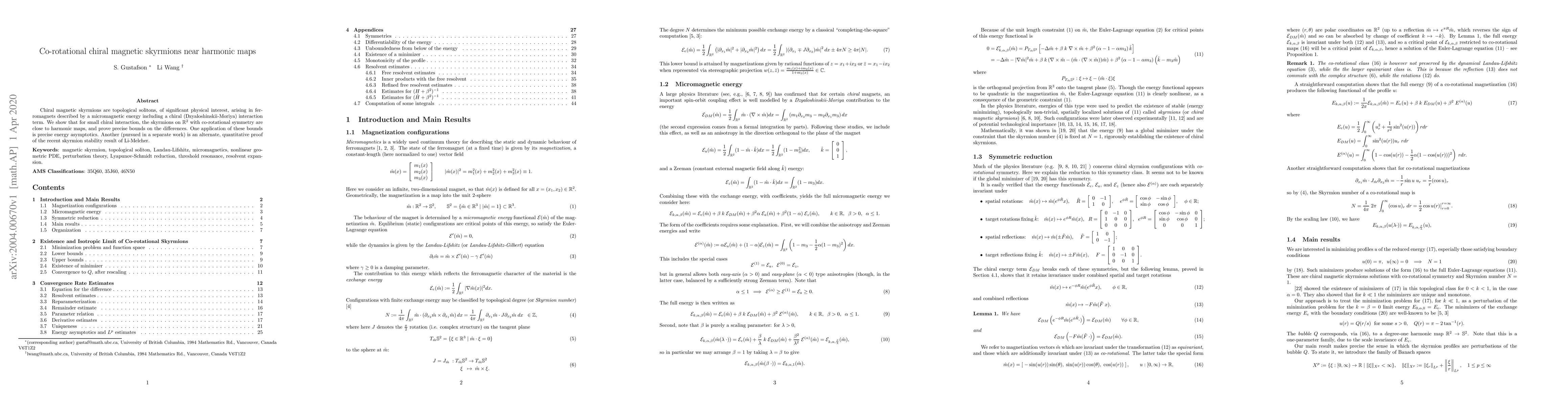 This paper studies chiral magnetic skyrmions in ferromagnets with a Dzyaloshinskii-Moriya interaction, showing that for small chiral interactions, these skyrmions exhibit co-rotational symmetry and closely resemble harmonic maps, with precise bounds on their differences. The findings enable accurate energy asymptotics and provide a quantitative proof for skyrmion stability.