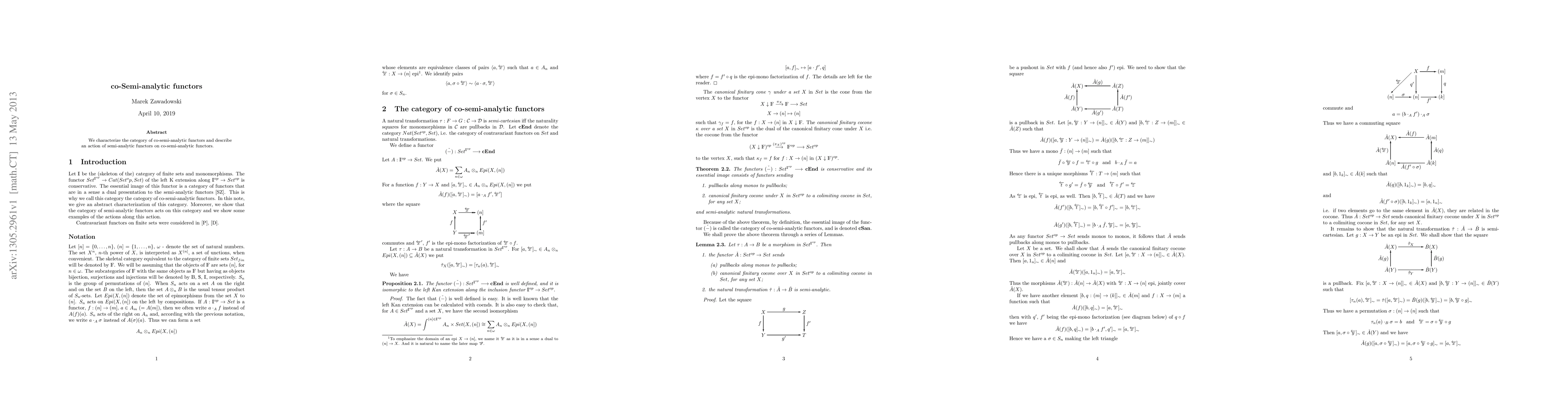 This paper characterizes the category of co-semi-analytic functors and explores how semi-analytic functors can act upon them, providing a foundational framework for their interactions.