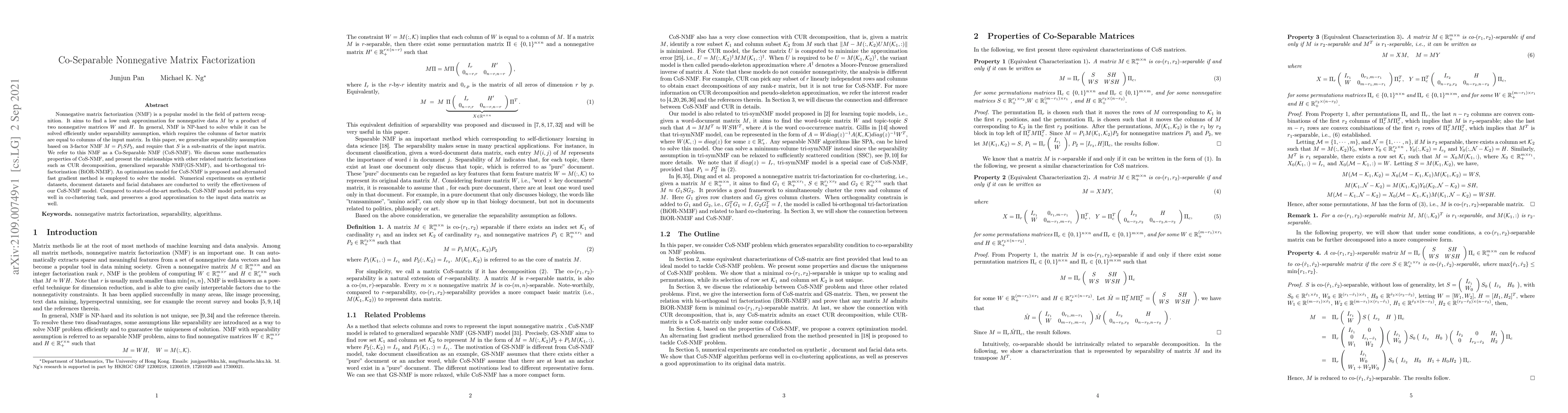 Nonnegative matrix factorization (NMF) is a popular model in the field of pattern recognition. It aims to find a low rank approximation for nonnegative data M by a product of two nonnegative matrices W and H. In general, NMF is NP-hard to solve while it can be solved efficiently under separability assumption, which requires the columns of factor matrix are equal to columns of the input matrix. In this paper, we generalize separability assumption based on 3-factor NMF M=P_1SP_2, and require that S is a sub-matrix of the input matrix. We refer to this NMF as a Co-Separable NMF (CoS-NMF). We discuss some mathematics properties of CoS-NMF, and present the relationships with other related matrix factorizations such as CUR decomposition, generalized separable NMF(GS-NMF), and bi-orthogonal tri-factorization (BiOR-NM3F). An optimization model for CoS-NMF is proposed and alternated fast gradient method is employed to solve the model. Numerical experiments on synthetic datasets, document datasets and facial databases are conducted to verify the effectiveness of our CoS-NMF model. Compared to state-of-the-art methods, CoS-NMF model performs very well in co-clustering task, and preserves a good approximation to the input data matrix as well.