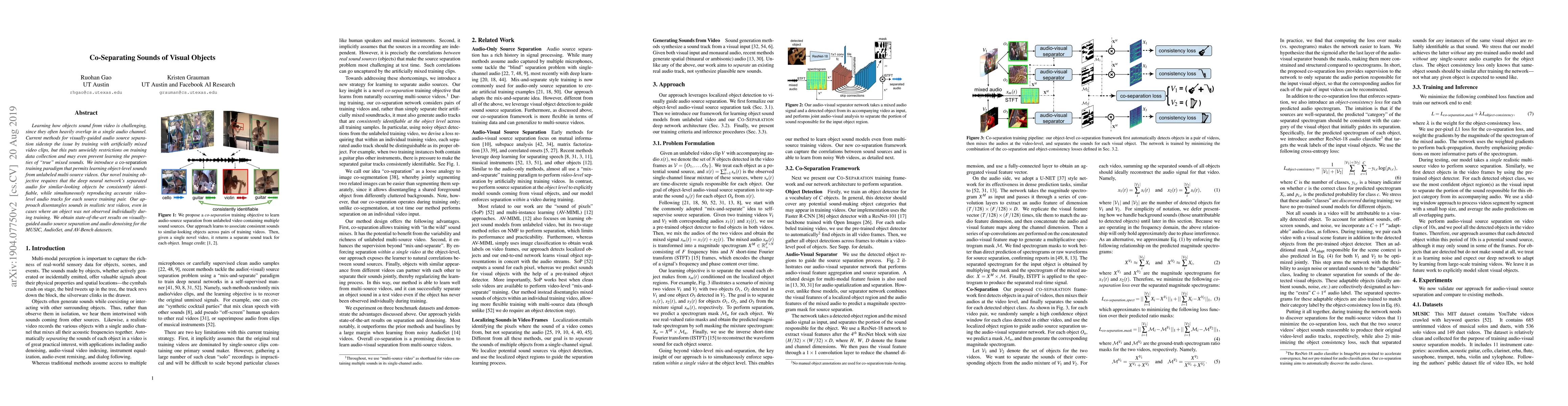 Learning how objects sound from video is challenging, since they often heavily overlap in a single audio channel. Current methods for visually-guided audio source separation sidestep the issue by training with artificially mixed video clips, but this puts unwieldy restrictions on training data collection and may even prevent learning the properties of "true" mixed sounds. We introduce a co-separation training paradigm that permits learning object-level sounds from unlabeled multi-source videos. Our novel training objective requires that the deep neural network's separated audio for similar-looking objects be consistently identifiable, while simultaneously reproducing accurate video-level audio tracks for each source training pair. Our approach disentangles sounds in realistic test videos, even in cases where an object was not observed individually during training. We obtain state-of-the-art results on visually-guided audio source separation and audio denoising for the MUSIC, AudioSet, and AV-Bench datasets.