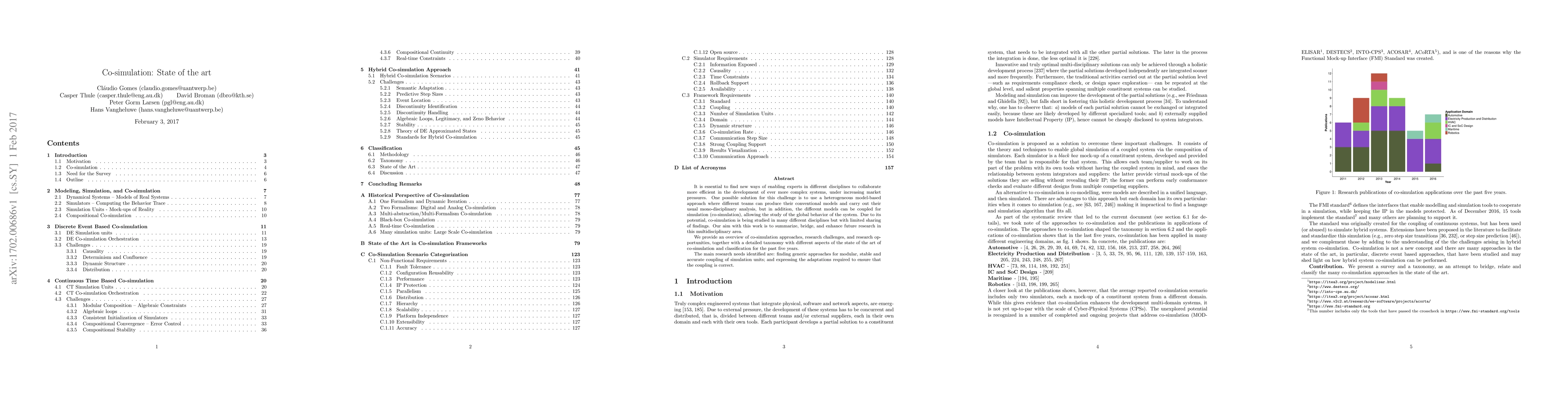 It is essential to find new ways of enabling experts in different disciplines to collaborate more efficient in the development of ever more complex systems, under increasing market pressures. One possible solution for this challenge is to use a heterogeneous model-based approach where different teams can produce their conventional models and carry out their usual mono-disciplinary analysis, but in addition, the different models can be coupled for simulation (co-simulation), allowing the study of the global behavior of the system. Due to its potential, co-simulation is being studied in many different disciplines but with limited sharing of findings. Our aim with this work is to summarize, bridge, and enhance future research in this multidisciplinary area. We provide an overview of co-simulation approaches, research challenges, and research opportunities, together with a detailed taxonomy with different aspects of the state of the art of co-simulation and classification for the past five years. The main research needs identified are: finding generic approaches for modular, stable and accurate coupling of simulation units; and expressing the adaptations required to ensure that the coupling is correct.