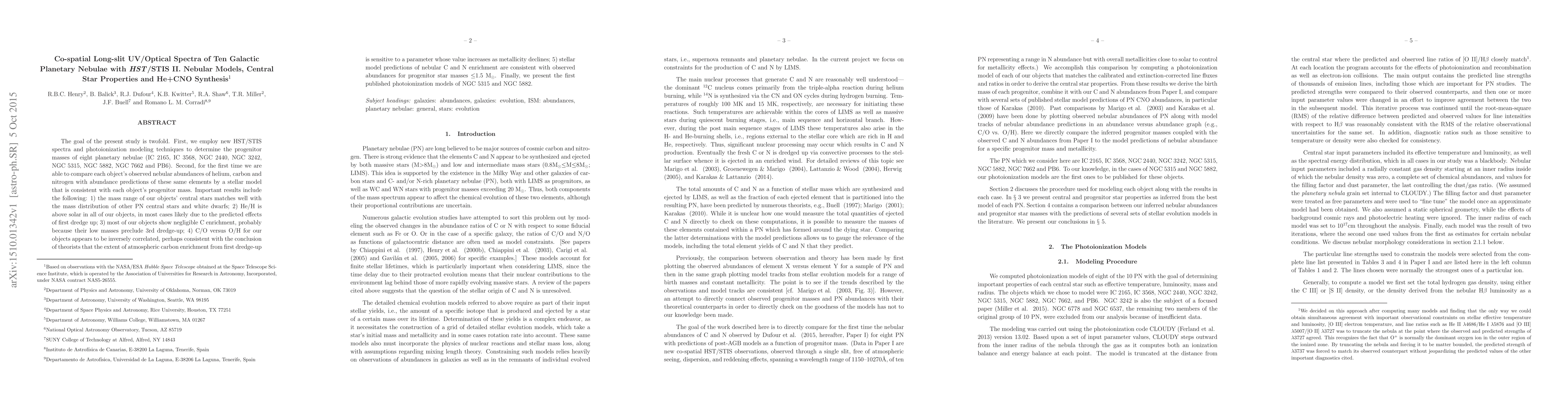 The goal of the present study is twofold. First, we employ new HST/STIS spectra and photoionization modeling techniques to determine the progenitor masses of eight planetary nebulae (IC 2165, IC 3568, NGC 2440, NGC 3242, NGC 5315, NGC 5882, NGC 7662 and PB6). Second, for the first time we are able to compare each object's observed nebular abundances of helium, carbon and nitrogen with abundance predictions of these same elements by a stellar model that is consistent with each object's progenitor mass. Important results include the following: 1) the mass range of our objects' central stars matches well with the mass distribution of other PN central stars and white dwarfs; 2) He/H is above solar in all of our objects, in most cases likely due to the predicted effects of first dredge up; 3) most of our objects show negligible C enrichment, probably because their low masses preclude 3rd dredge-up; 4) C/O versus O/H for our objects appears to be inversely correlated, perhaps consistent with the conclusion of theorists that the extent of atmospheric carbon enrichment from first dredge-up is sensitive to a parameter whose value increases as metallicity declines; 5) stellar model predictions of nebular C and N enrichment are consistent with observed abundances for progenitor star masses <=1.5 Msun. Finally, we present the first published photoionization models of NGC 5315 and NGC 5882.