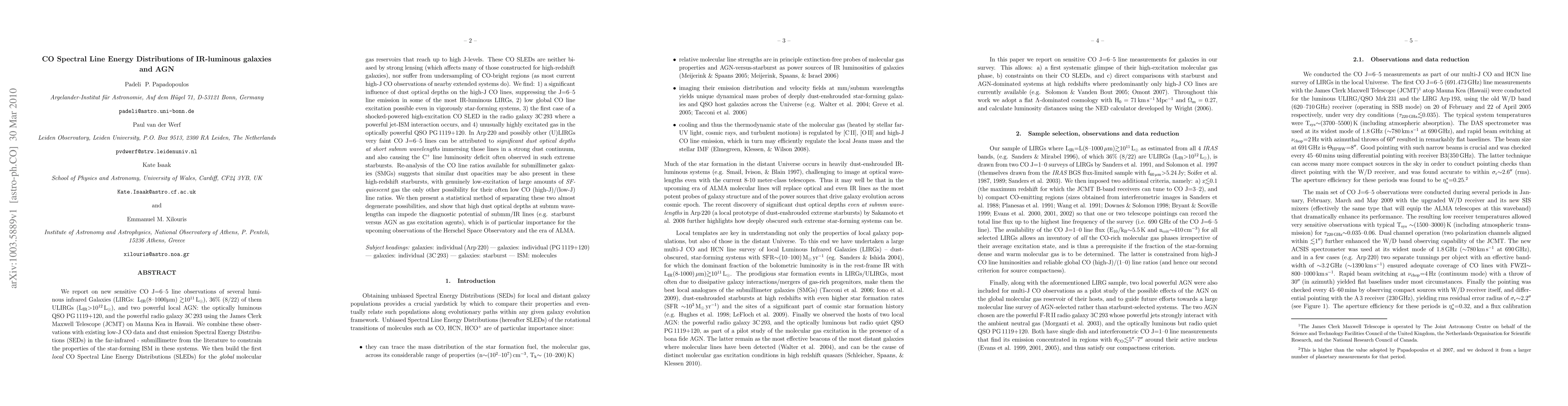 We report on new sensitive CO J=6-5 line observations of several luminous infrared Galaxies (LIRGs: L$_{\rm IR}$(8-1000$\mu $m$)\ga 10^{11}$ L$_{\odot}$), 36% (8/22) of them ULIRGs (L$_{\rm IR}$$>10^{12}$ L$_{\odot}$), and two powerful local AGN: the optically luminous QSO PG 1119+120, and the powerful radio galaxy 3C 293 using the James Clerk Maxwell Telescope (JCMT) on Mauna Kea in Hawaii. We combine these observations with existing low-J CO data and dust emission Spectral Energy Distributions (SEDs) in the far-infrared - submillimetre from the literature to constrain the properties of the star-forming ISM in these systems. We then build the first {\it local} CO Spectral Line Energy Distributions (SLEDs) for the {\it global} molecular gas reservoirs that reach up to high J-levels. These CO SLEDs are neither biased by strong lensing (which affects many of those constructed for high-redshift galaxies), nor suffer from undersampling of CO-bright regions (as most current high-J CO observations of nearby extended systems do). We find: ...