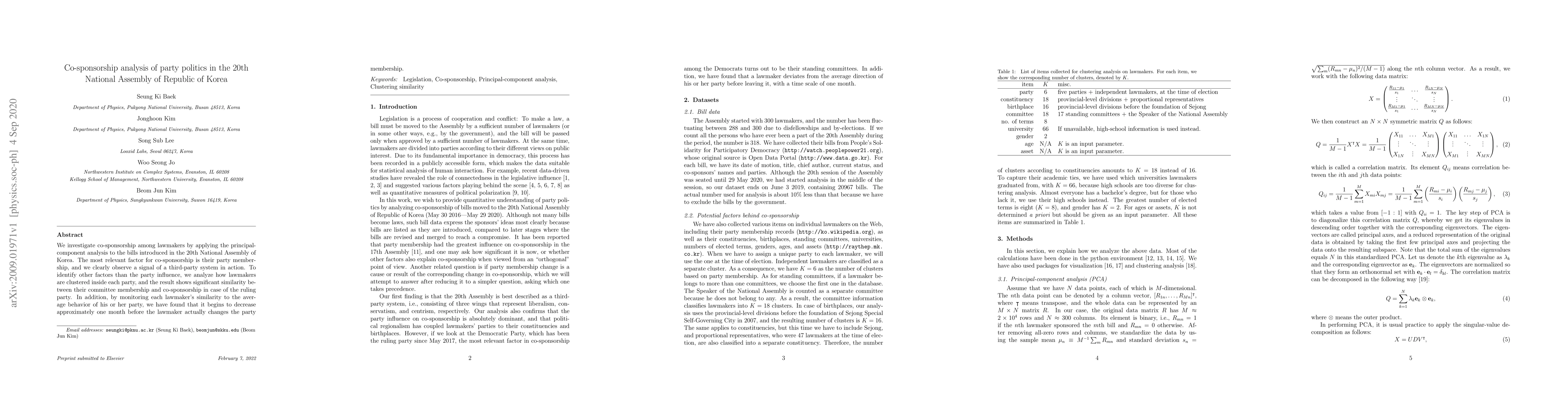 This study uses principal-component analysis to examine co-sponsorship patterns among lawmakers in Korea's 20th National Assembly, revealing that party membership is the primary factor influencing co-sponsorship. It also identifies significant clustering within the ruling party based on committee membership and notes a decrease in lawmakers' alignment with their party's average behavior a month before party membership changes.
