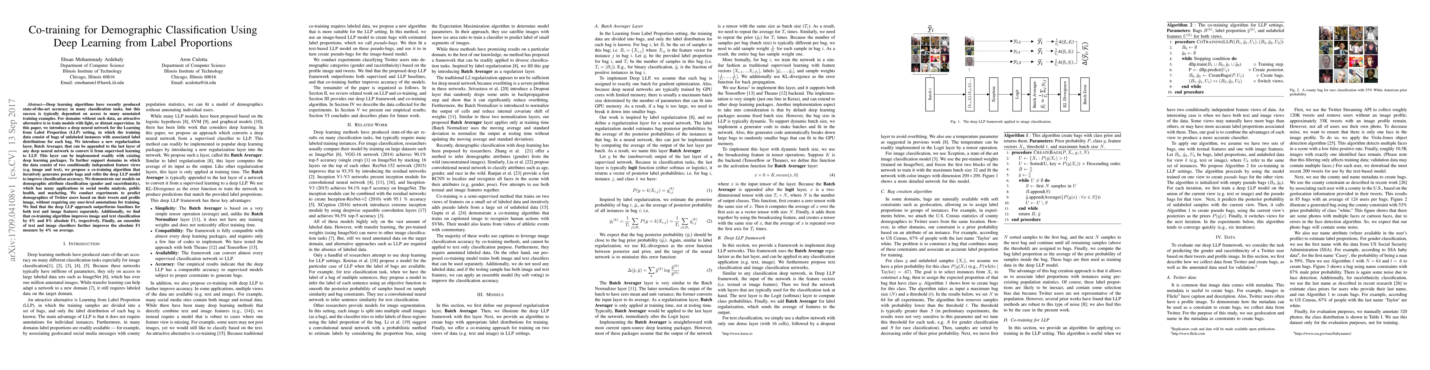 This research introduces a deep neural network designed for training with label proportions, rather than full annotations, using a Batch Averager regularization layer. It also proposes a co-training algorithm for two independent feature views, like images and text, to enhance demographic attribute classification (gender, race/ethnicity) accuracy from social media data without user-level annotations. The method outperforms baselines and an ensemble of text and image classifiers further improves results.
