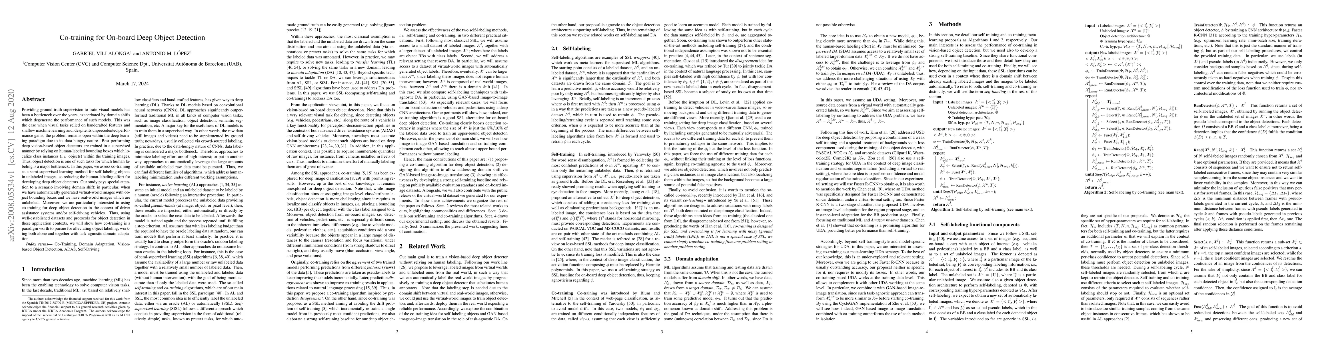 Providing ground truth supervision to train visual models has been a bottleneck over the years, exacerbated by domain shifts which degenerate the performance of such models. This was the case when visual tasks relied on handcrafted features and shallow machine learning and, despite its unprecedented performance gains, the problem remains open within the deep learning paradigm due to its data-hungry nature. Best performing deep vision-based object detectors are trained in a supervised manner by relying on human-labeled bounding boxes which localize class instances (i.e.objects) within the training images.Thus, object detection is one of such tasks for which human labeling is a major bottleneck. In this paper, we assess co-training as a semi-supervised learning method for self-labeling objects in unlabeled images, so reducing the human-labeling effort for developing deep object detectors. Our study pays special attention to a scenario involving domain shift; in particular, when we have automatically generated virtual-world images with object bounding boxes and we have real-world images which are unlabeled. Moreover, we are particularly interested in using co-training for deep object detection in the context of driver assistance systems and/or self-driving vehicles. Thus, using well-established datasets and protocols for object detection in these application contexts, we will show how co-training is a paradigm worth to pursue for alleviating object labeling, working both alone and together with task-agnostic domain adaptation.
