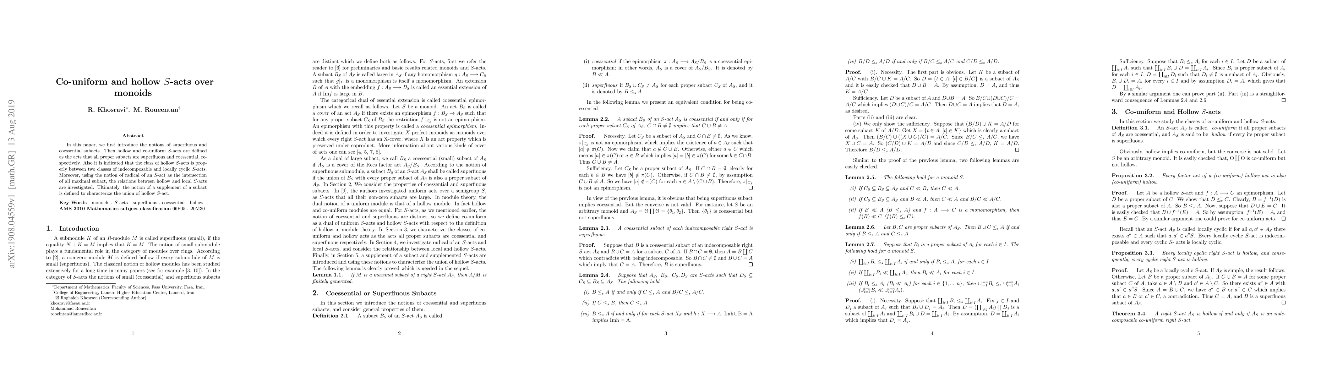 The paper introduces and analyzes the concepts of hollow and co-uniform S-acts, providing a detailed characterization of their properties and relationships with other S-act classes.