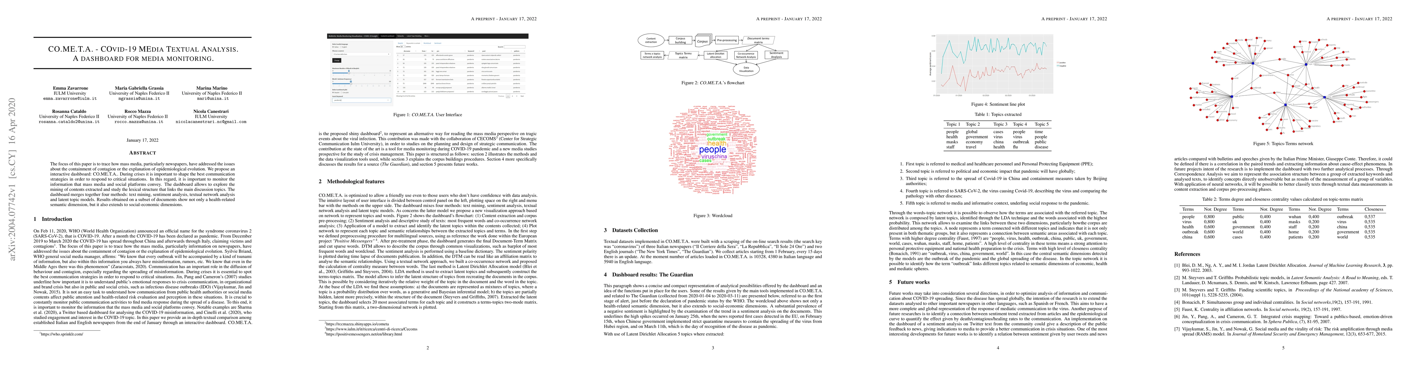 This paper introduces CO.ME.T.A., an interactive dashboard for monitoring media coverage of COVID-19, integrating text mining, sentiment analysis, network analysis, and latent topic models to explore health and socio-economic discussions. The dashboard aims to shape effective communication strategies during crises.